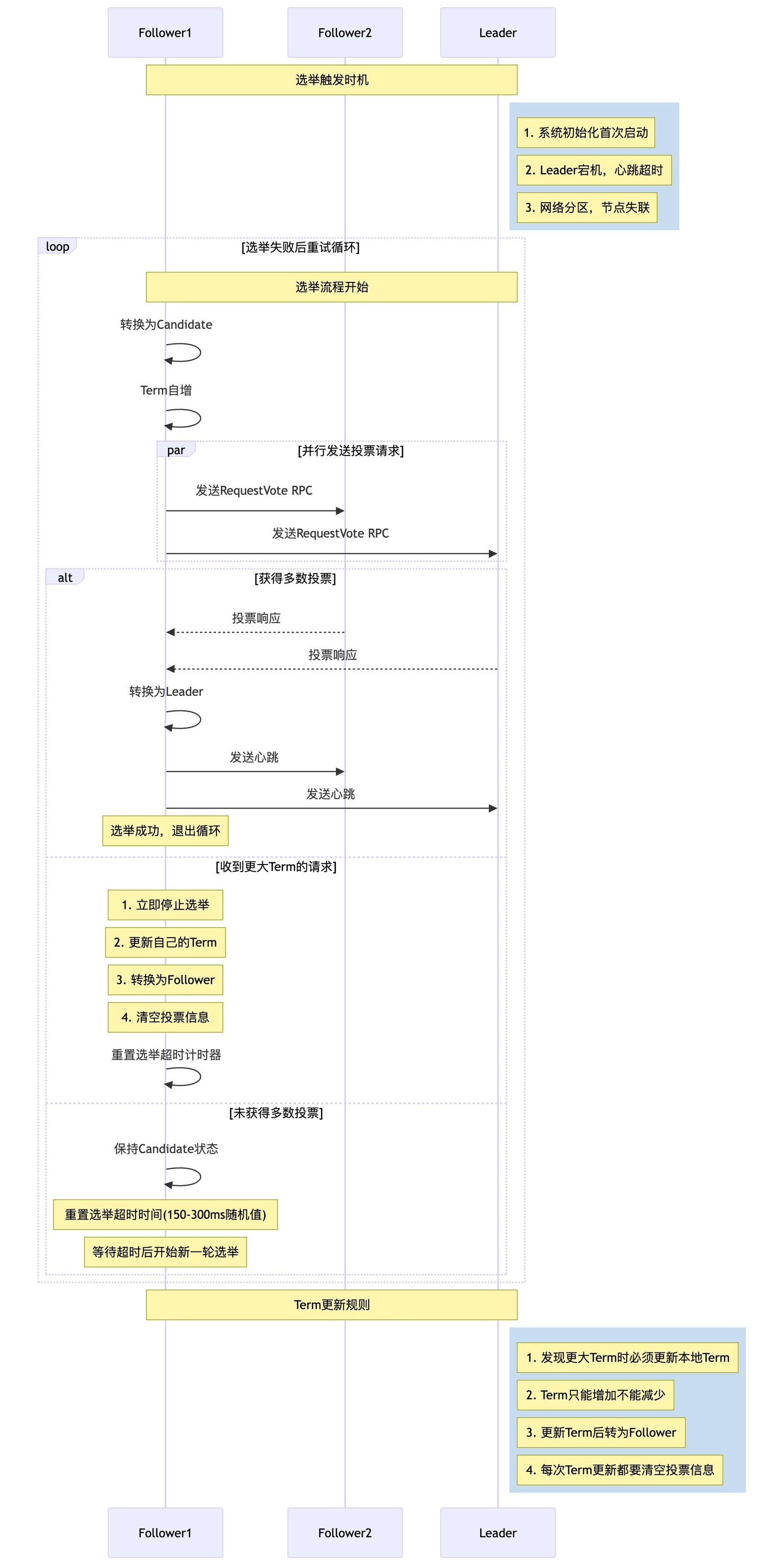 选举周期:所有 Raft 节点参与选举投票,每个节点只有 1 次投票机会,若所有节点投票完,没有形成多数派胜选者(Leader),则会自动进入下一轮选举,直到选举出 Leader 为止。每新增一个选举周期,LogEntry 的 term 属性会自增 1。