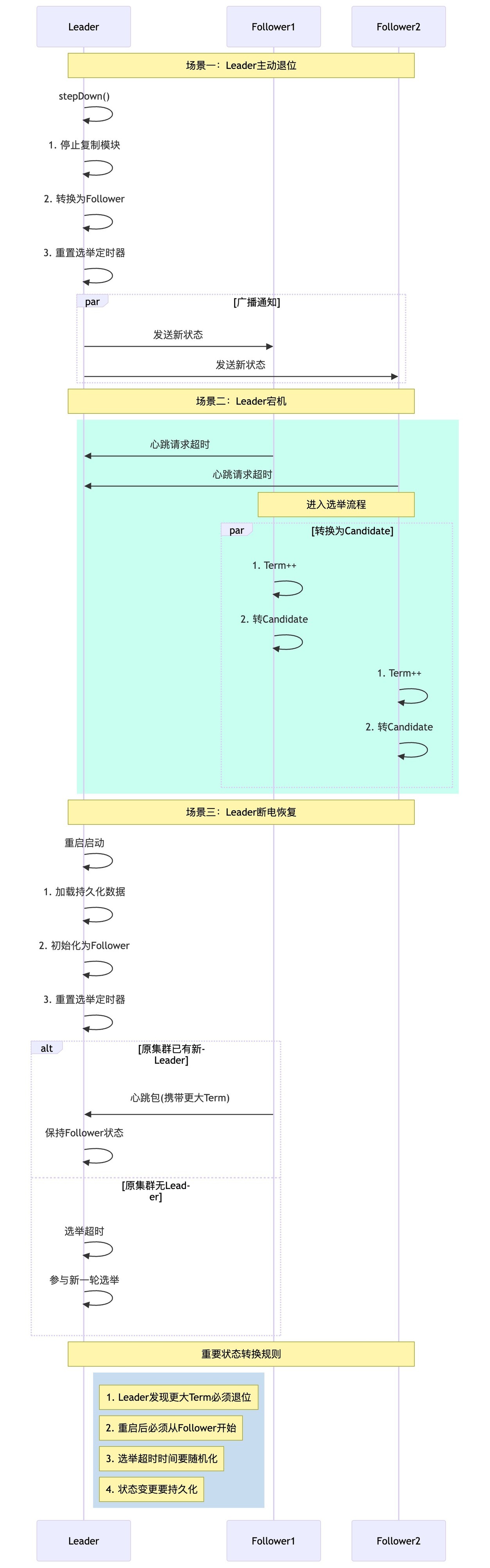 当 Leader 宕机或无法正常向所有 Follower 节点发送存活心跳(默认间隔 100ms),自动触发新的选举(第一个发起选举投票的 Follower 接会投票给自己,自己成为候选者 Candidate)。