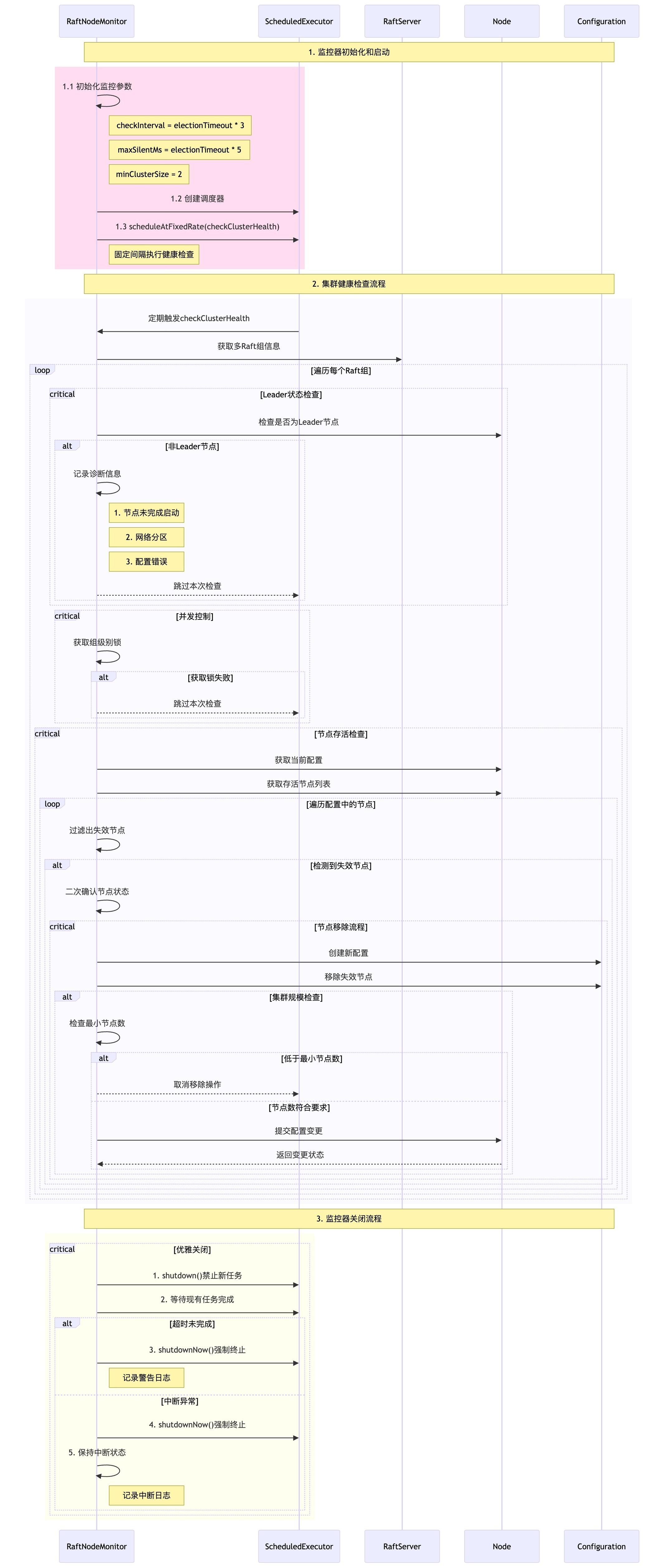 RaftMonitor 监听器主要是为了监听各个 Raft 节点状态,通过心跳机制,及时清理已宕机或通信连接失败的 Raft 节点。避免客户端 RPC 请求和长连接指向无效的 Raft 节点。主链路代码图解如下所示: