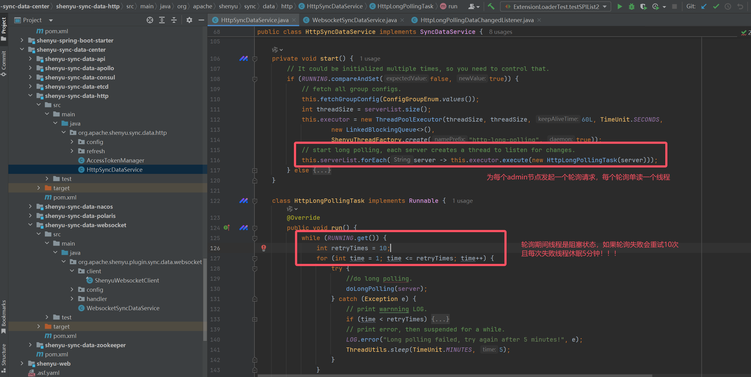 同样地,Shenyu 网关基于 WebSocket 全双工通信方式实现的配置拉取和同步,也是会为每个 admin 节点开辟一个独立线程: