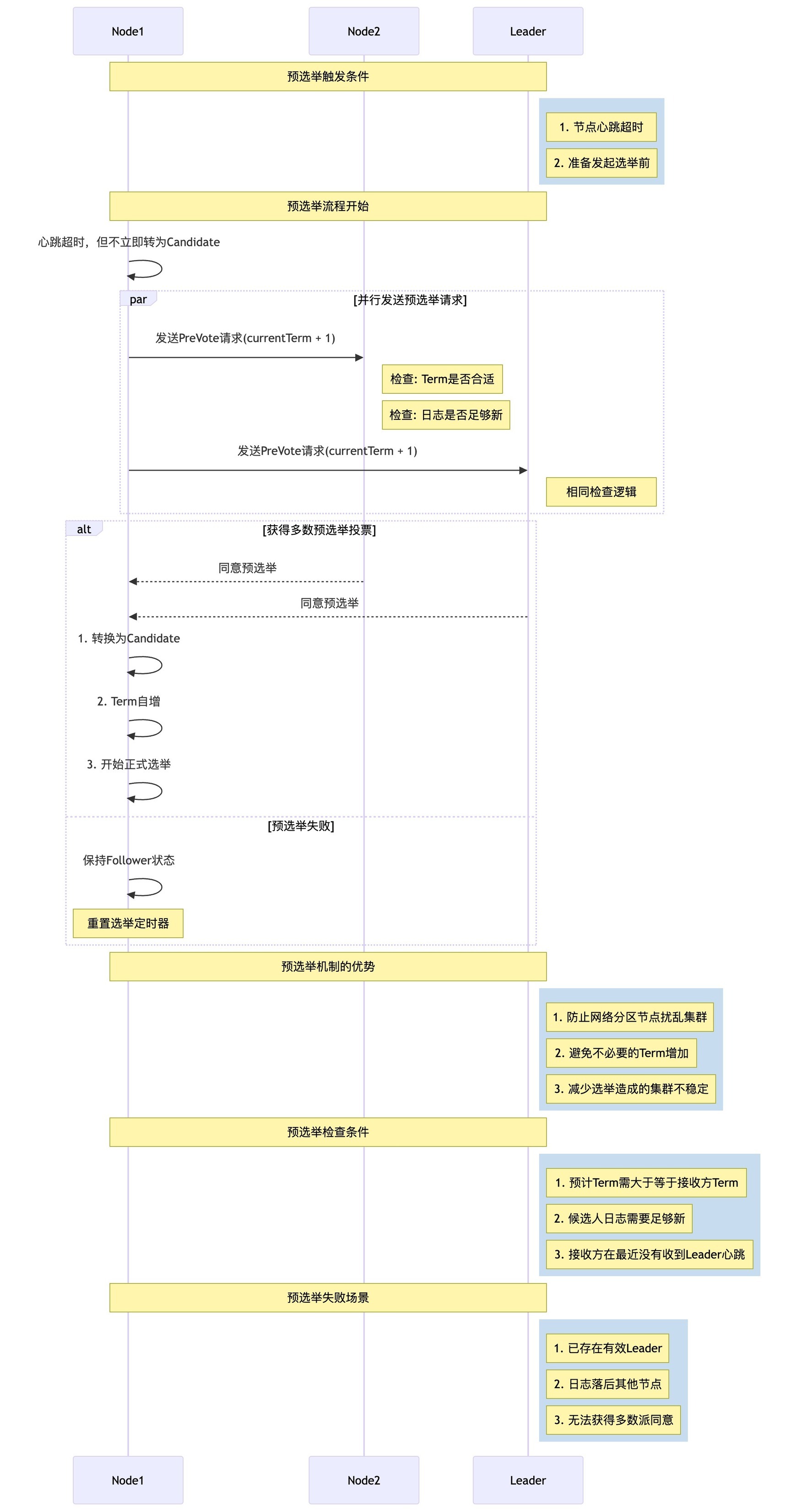 Raft 协议中并没有定义预选举机制,这是 JRaft 自己在 Raft 协议基础上做的优化;目的是减少 Raft 集群选举期间带来的抖动,加快正式选举的 Leader 诞生,降低选举周期 Term 次数。