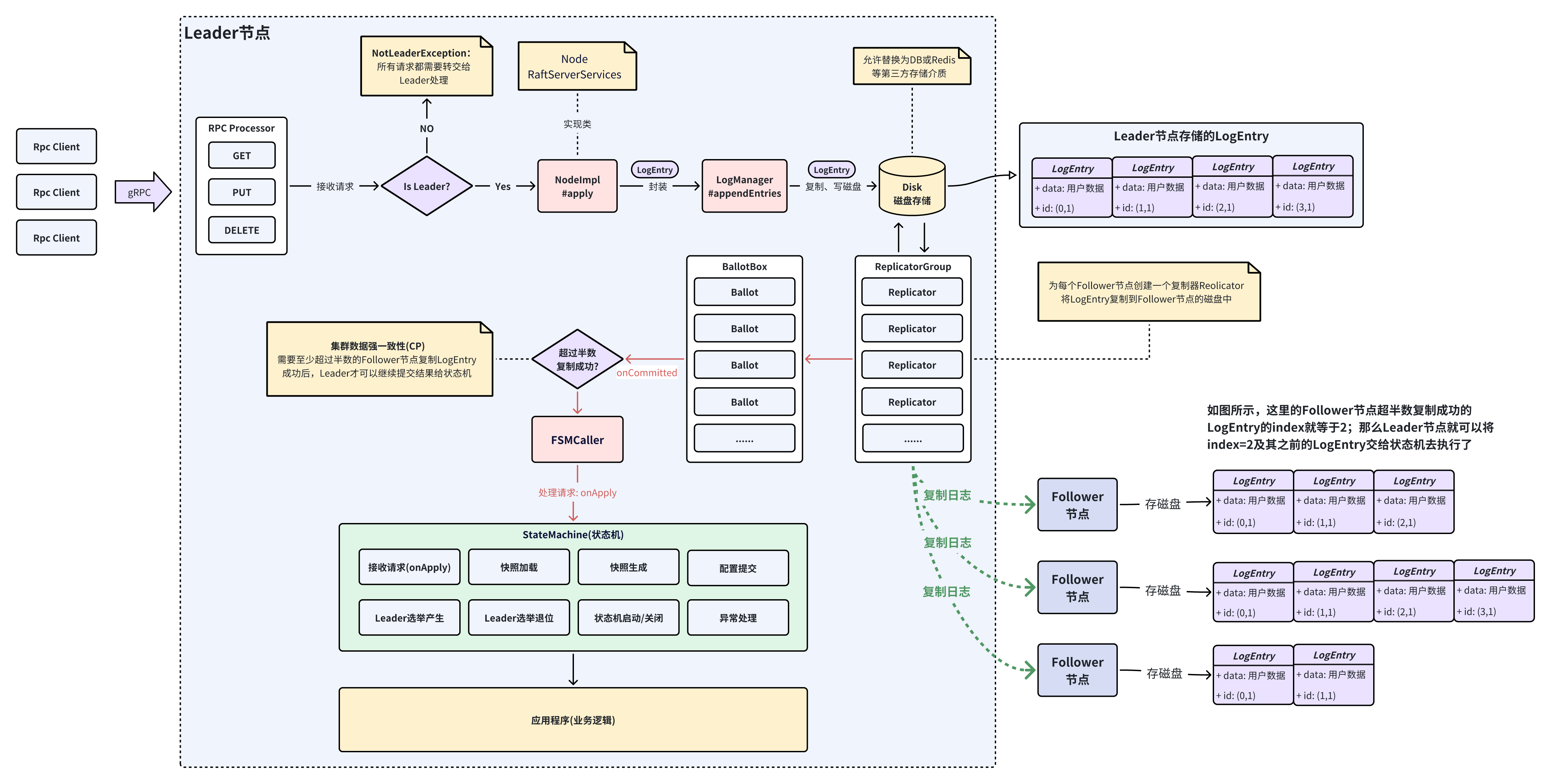Raft 收到用户(客户端)请求时,会先交给 Raft 协议处理,只有 Leader 节点可以执行读写请求。Leader 会先将用户请求打包成 LogEntry 写入磁盘,通过一个个 Replicator(复制器)将所有打包好的 LogEntry 复制到 Follower 节点,每复制成功一个 LogEntry,都会向计票器(BallotBox)增加一次计票,直到某一时间点超过半数的 Follower 成功复制 LogEntry(index,term),这时候 BallotBox 会通知 Leader 将这些 LogEntry 打包成 Task 任务交给自己的状态机(StateMachine)处理。