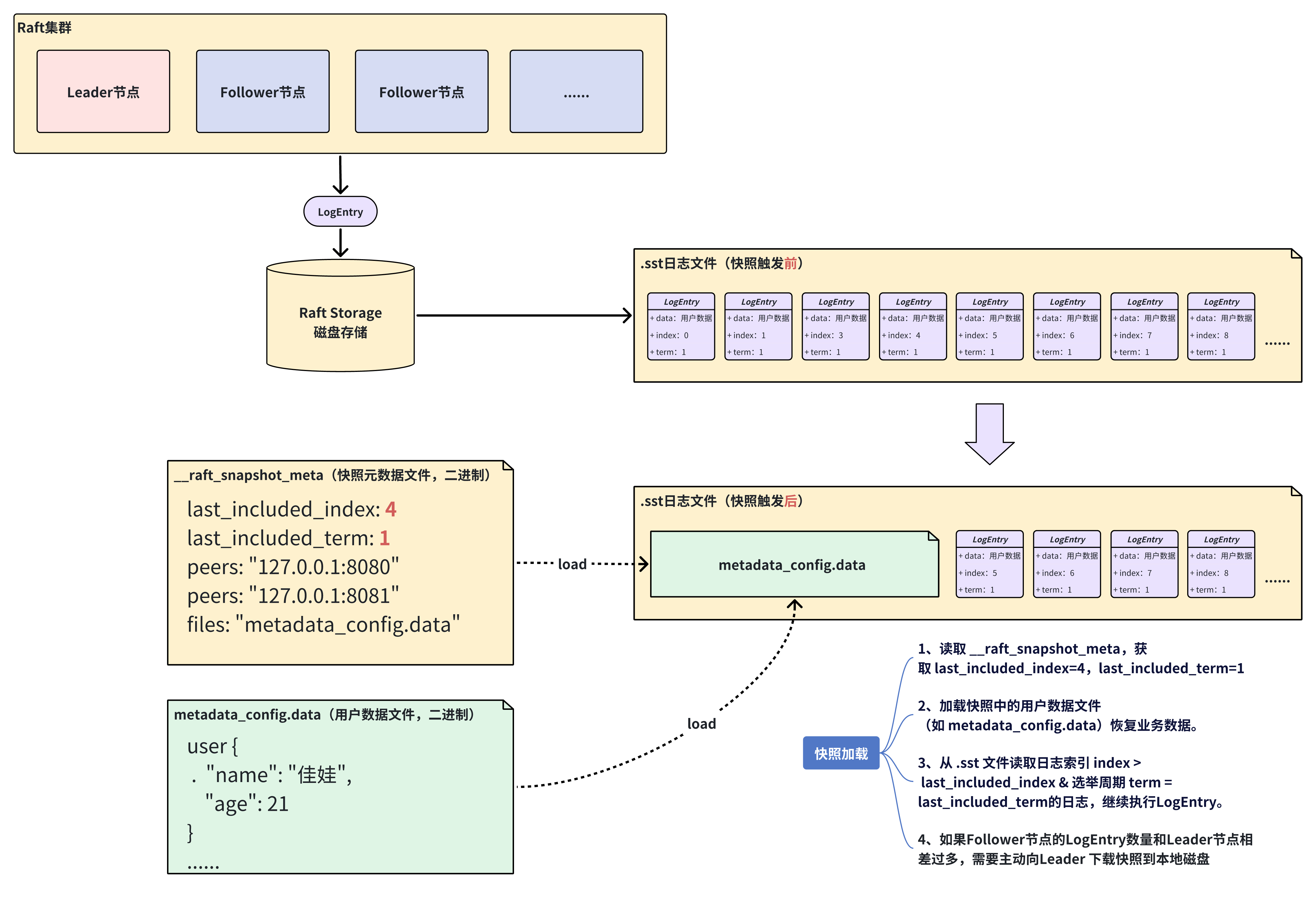 节点重启时,如果发现本地日志不完整(如被截断),会优先加载最近的快照恢复状态。