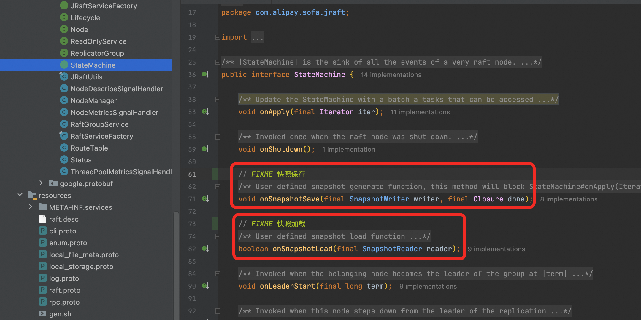JRaft 快照操作具体实现是由 com.alipay.sofa.jraft.StateMachine 接口定义的: