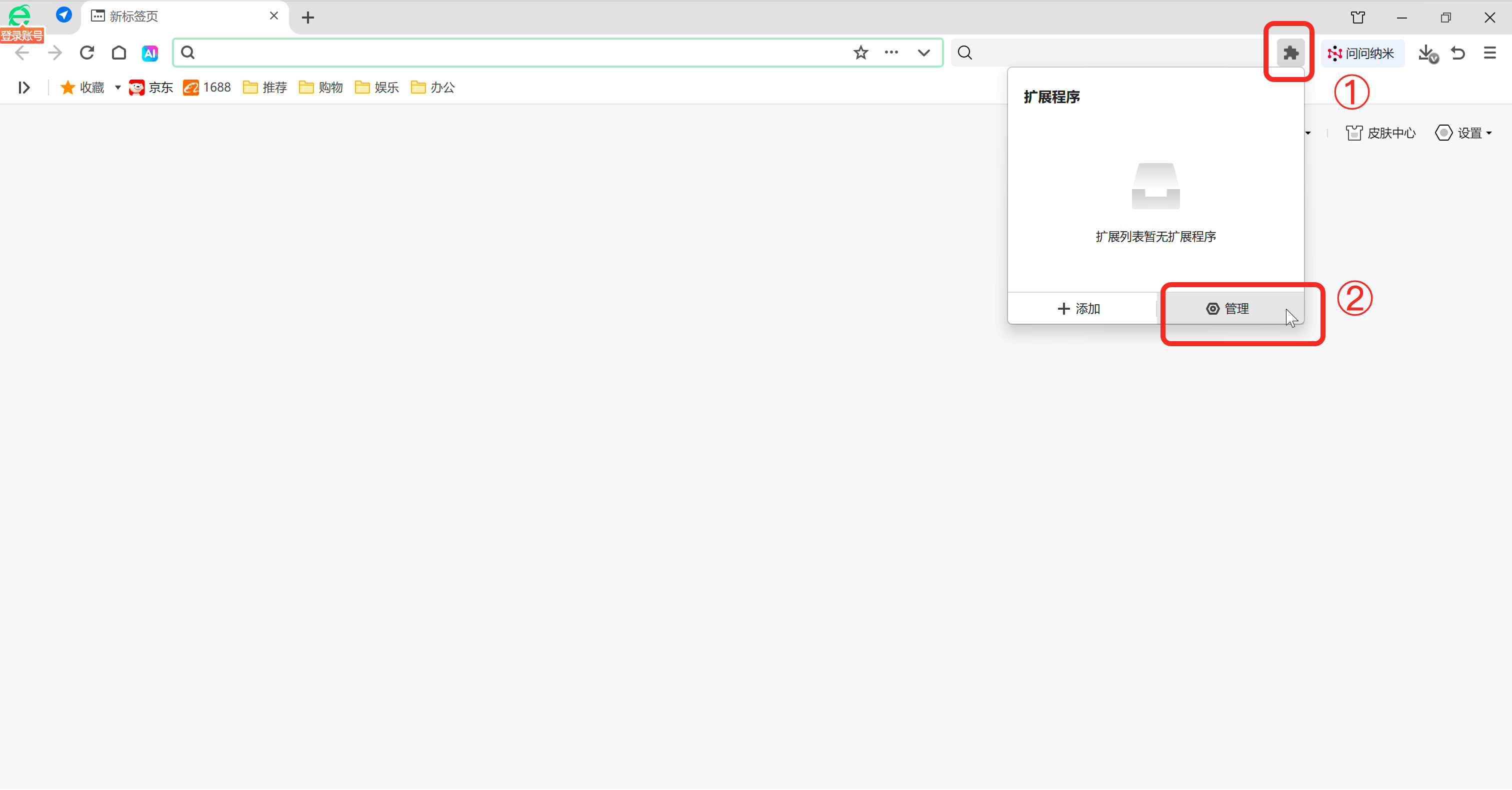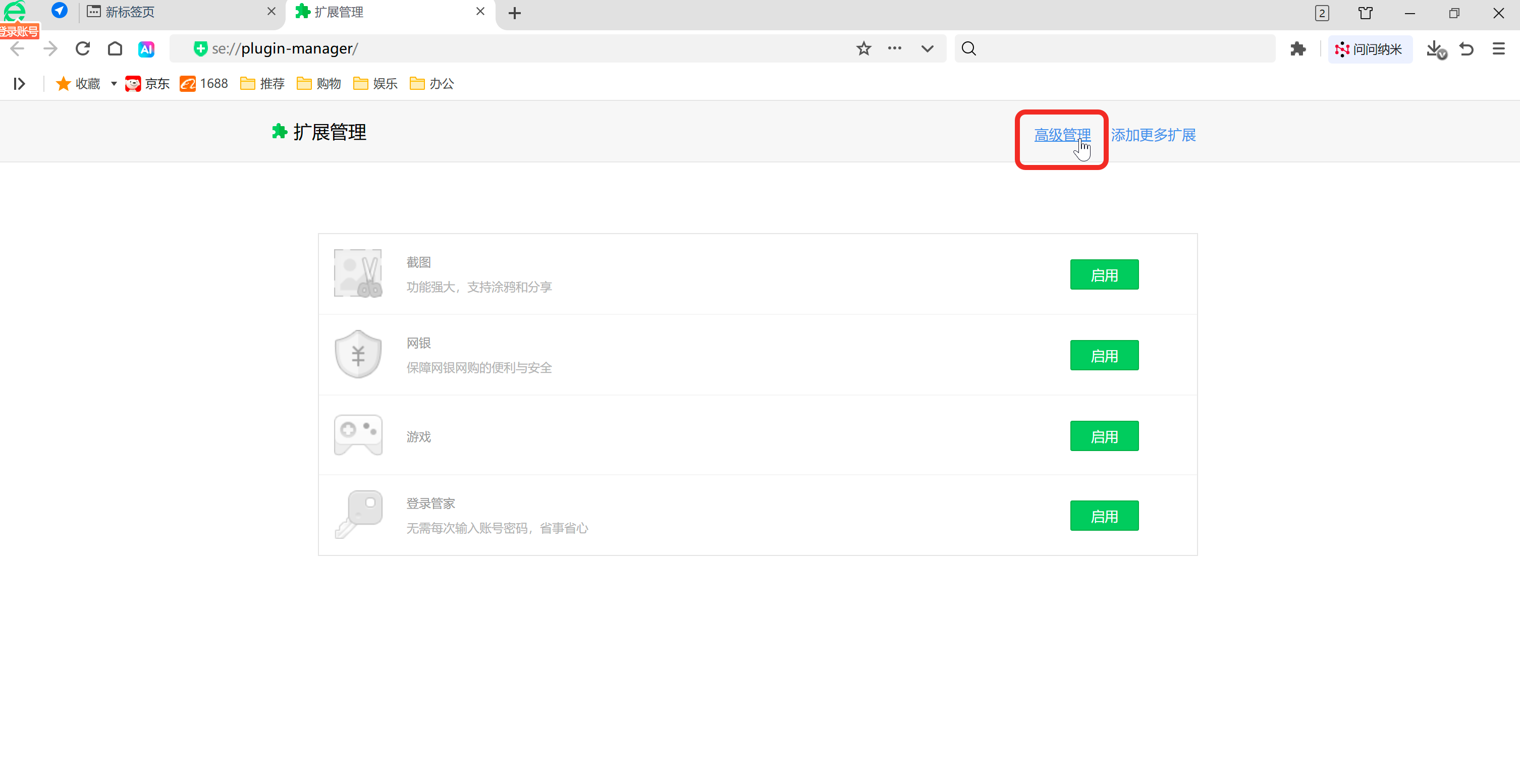 2.5.2 点击 360 浏览器 右上角的「扩展」图标,选择「管理」,继续点击「高级管理」
