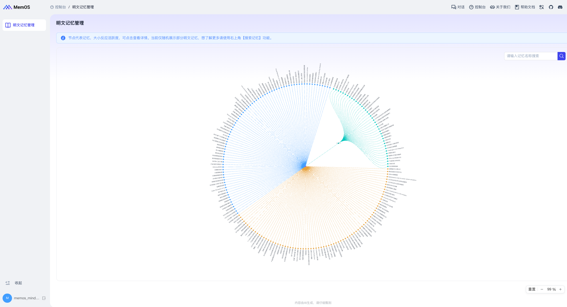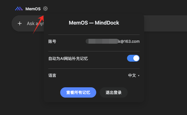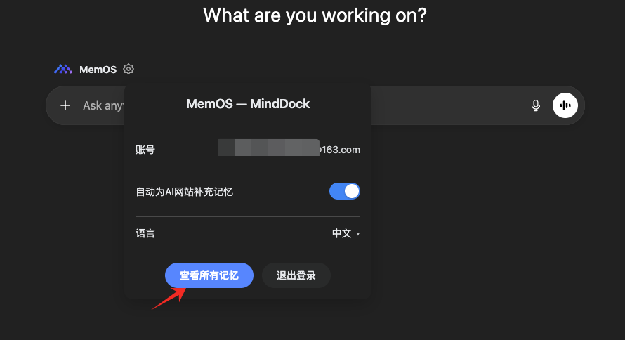 您可以通过这里快速查看并管理您在所有平台上的记忆,点击「查看记忆」按钮,MindDock 会自动跳转至 MemOS Playground。