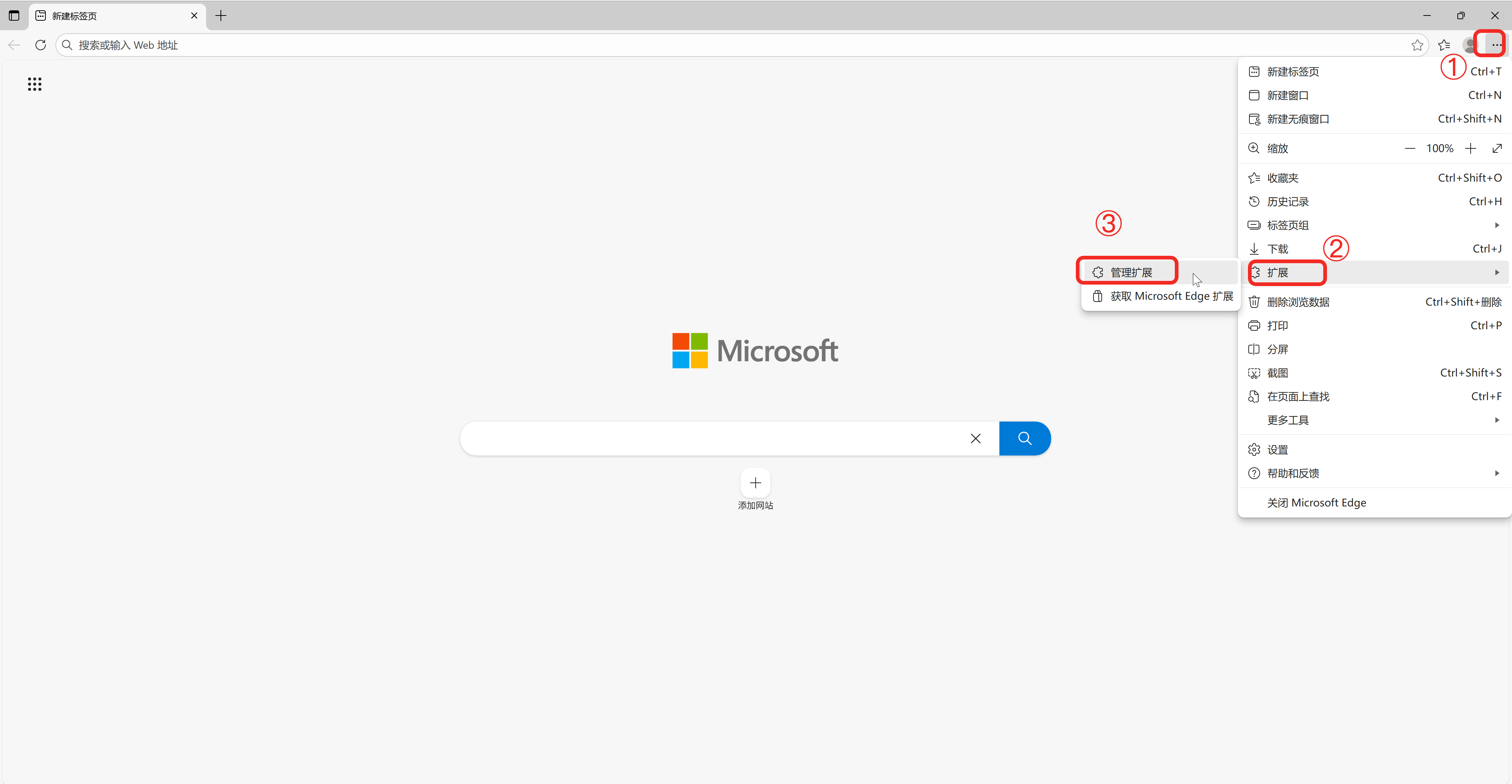 2.4.2 点击 Edge 右上角的「菜单」图标,选择「扩展」,继续点击「管理扩展」