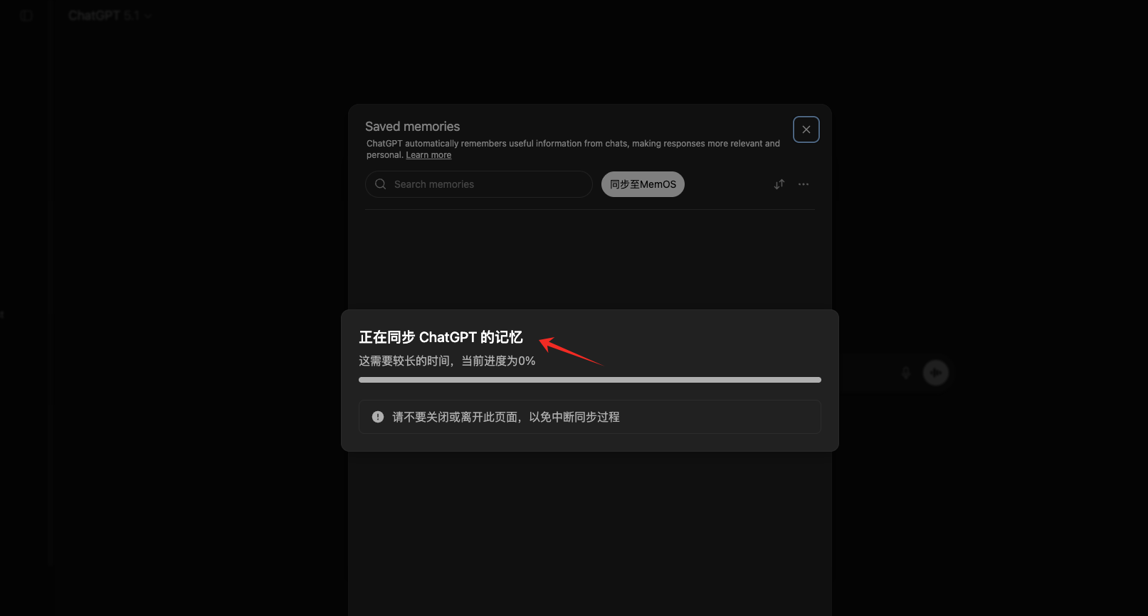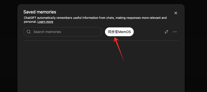 PS:如果记忆同步失败,您可以前往 ChatGPT,打开 ChatGPT 的【设置】-【个性化】-【记忆】-【管理】,点击【同步至 MemOS】,MindDock 会再次自动开启历史记忆与历史记录的爬取保存,同步最新信息
