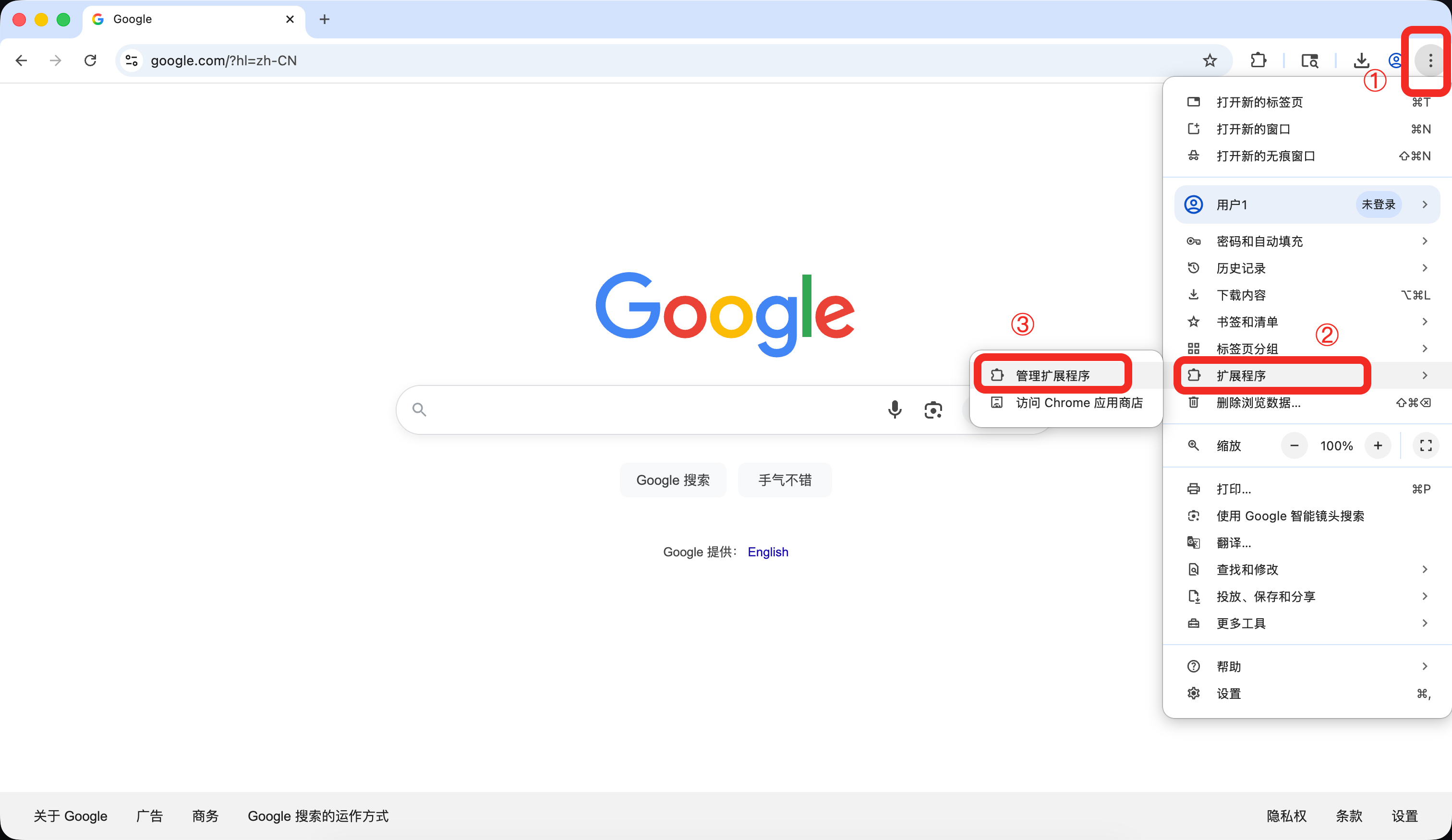 2.2.2 点击 Chrome 右上角的“菜单”图标,点击「扩展程序」,再点击『管理扩展程序』