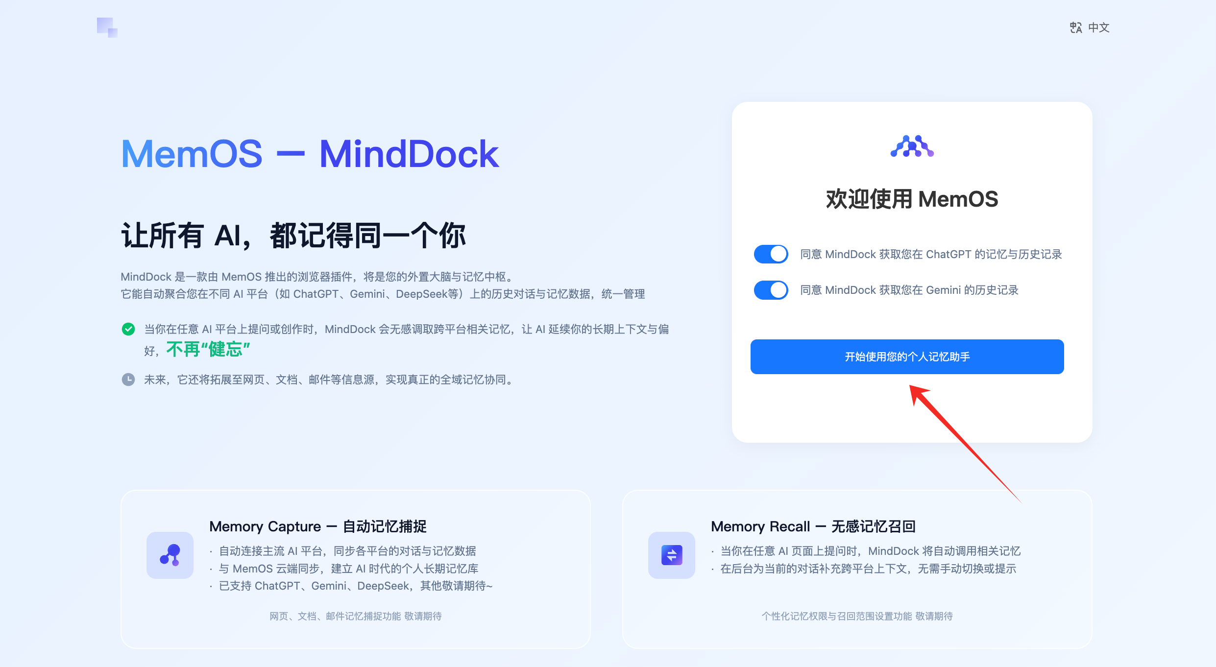 1.3.1 下载并成功安装后,浏览器会自动跳转 MindDock 首页,请登陆 MindDock 并授权获取历史记忆信息。