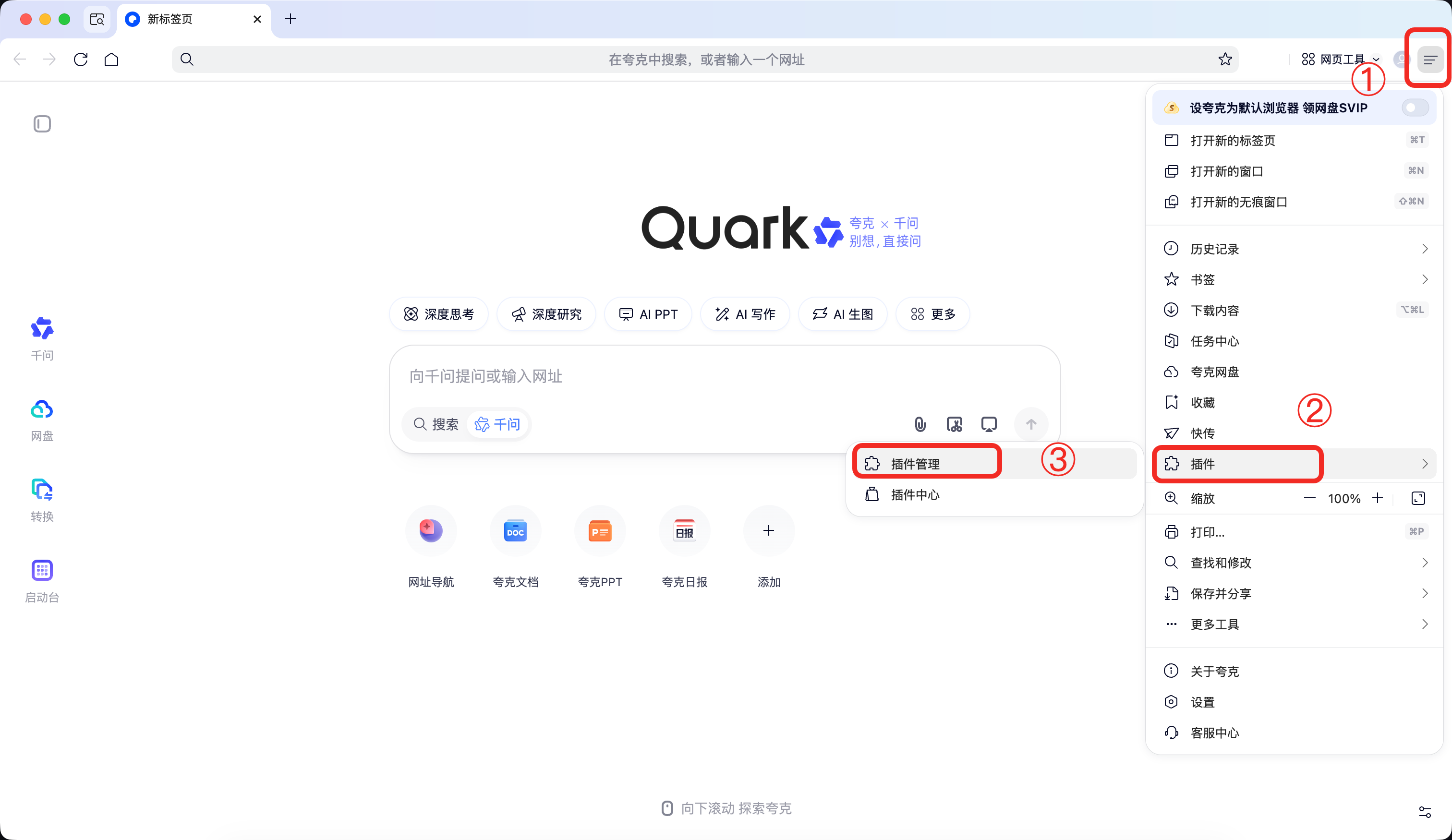 2.3.2 点击夸克浏览器右上角的「菜单」图标,选择「插件」,并点击「插件管理」