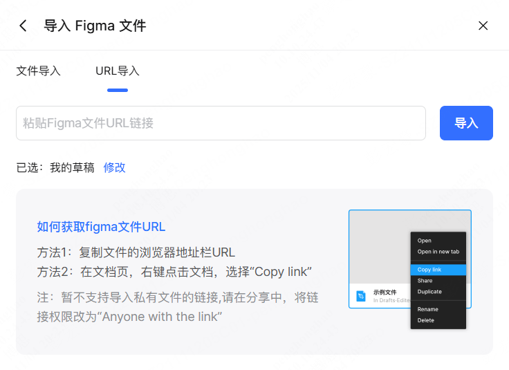 第二种方式则更为高效,即通过 URL 链接直接导入。你只需在 Figma 中获取文件的分享链接,粘贴到 Pixso 的导入窗口,Pixso 便会自动解析并获取文件内容,完成云端到云端的无缝迁移。这种方式省去了本地下载和上传的步骤,尤其适合批量迁移项目文件。