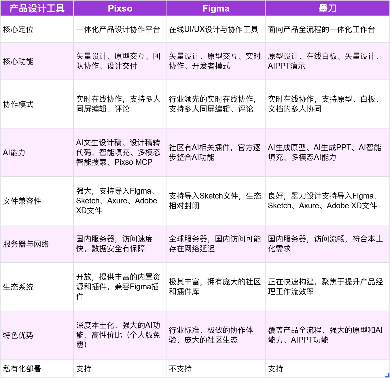 基于这个表格,我们可以清晰地看到,Pixso 则凭借其对国内用户需求的深刻理解、出色的兼容性和前沿的 AI 功能,成为了一个极具竞争力的 Figma 替代方案,尤其适合追求效率和智能化的本土团队。而墨刀则跳出了单纯“设计工具”的框架,致力于打通产品经理从需求到汇报的完整工作流,其在原型和 AI PPT 方面的创新,为产研团队提供了全新的价值。