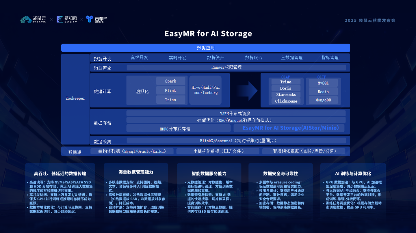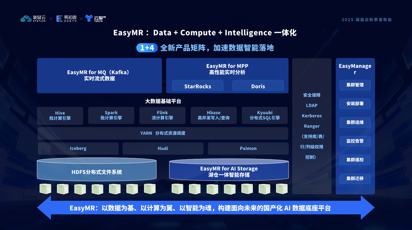 Easy MR 通过统一的存储计算架构、一体化的元数据与安全体系,以及全面的信创生态兼容,构建起支撑 AI 全链路落地的数据基础设施,真正让企业的数据为智能时代做好准备。