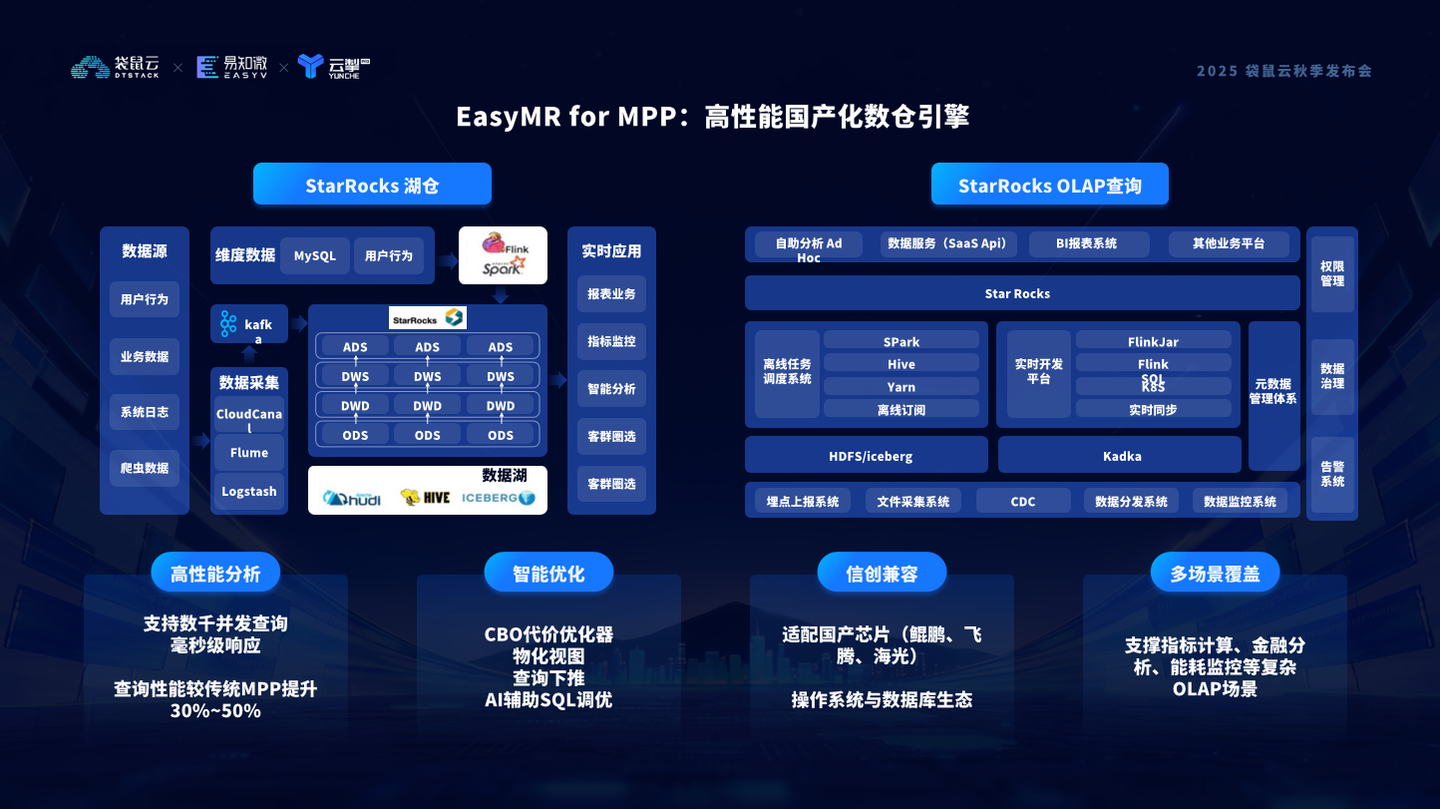 EasyMR for MPP 既可以作为企业的主数据仓库,提供存储计算能力,也可以作为外部分析库,为已有仓库提供更强大的 OLAP 查询能力。在性能上,EasyMR for MPP 单节点支持数千并发查询,实现毫秒级响应,整体查询性能相比传统 MPP 提升 30% 到 50%。同时它具备 智能优化能力:CBO 代价优化器、物化视图、查询下推机制,再加上 AI 辅助 SQL 调优,让分析更智能,资源利用更高效。不仅如此,它还全面兼容信创生态,无论运行在鲲鹏、飞腾、海光芯片,还是国产操作系统与数据库环境,都能做到稳定、可控、安全。