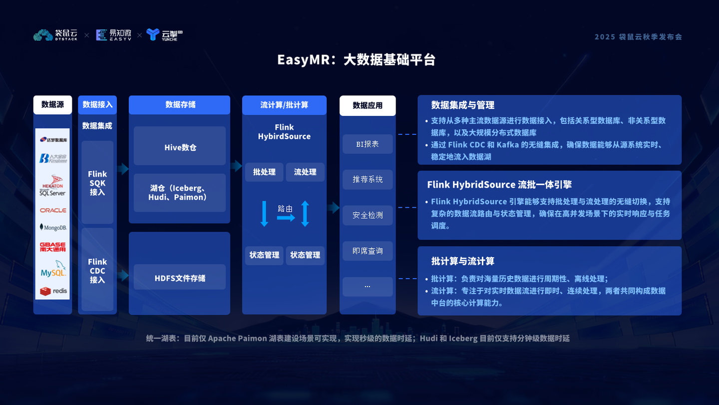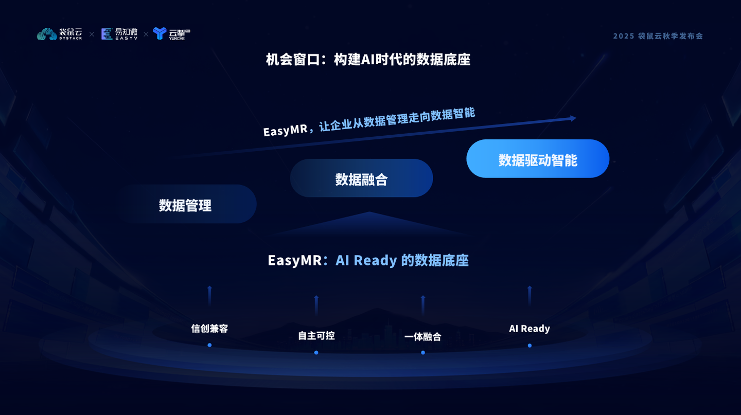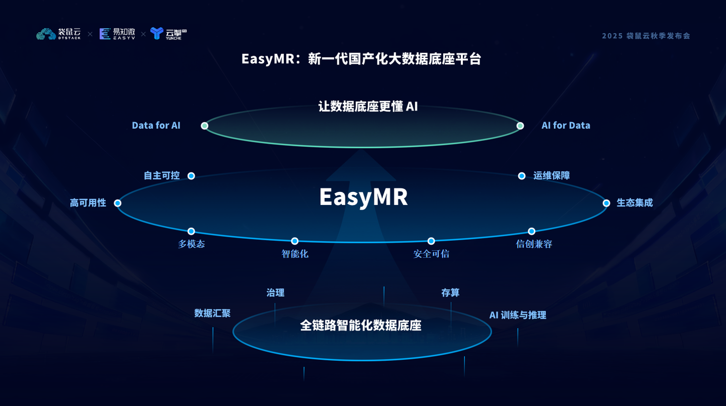 在这套底座之上,我们让企业的数据能够跨越结构壁垒,融合多模态信息,在统一架构中实现智能化处理、安全可信流转、信创环境兼容。更重要的是,EasyMR 不只是服务 AI,它也在让数据底座真正理解 AI(Dataf or AI),并通过 AI for Data 反哺治理、优化资源、提升效率。