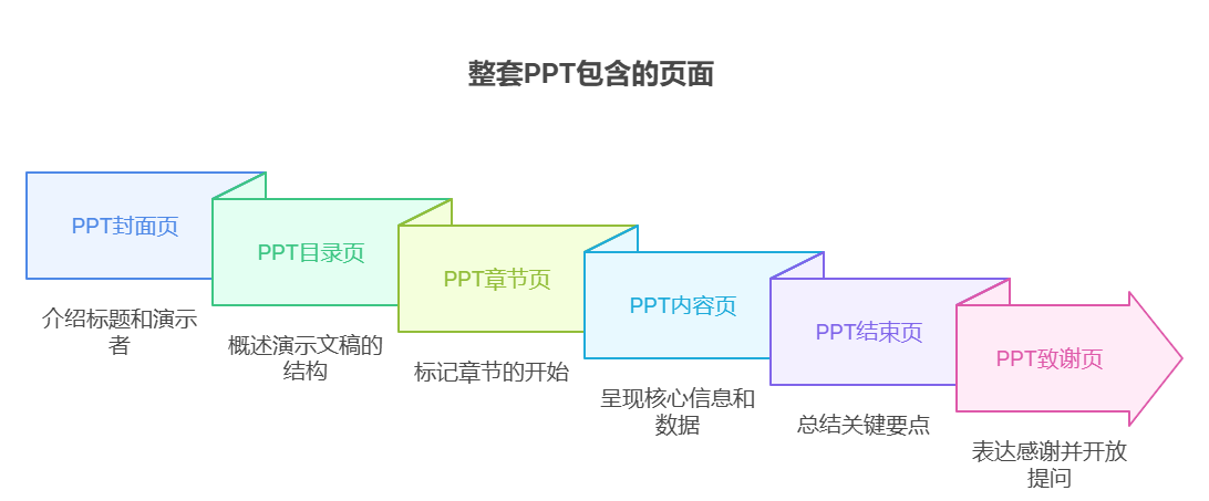 在介绍如何用 AI 自动生成 PPT 之前,我们有必要先了解,一套完整的、专业的 PPT 演示文稿都包含哪些页面——