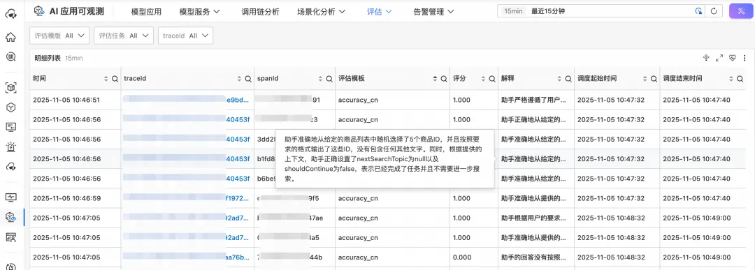 云监控 2.0 在 SQL/SPL 中提供评估算子,和预处理计算无缝衔接。其中,评估算子无缝集成 Qwen 等最先进的大模型,提升 LLM Judger 的评估能力。下方是通用评估模板中的准确性 accuracy,我们可以看到 Qwen 大模型对每个评估任务给出了评分。