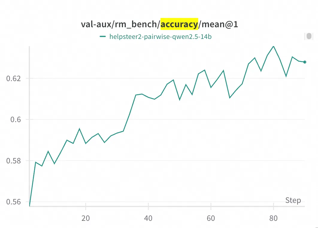 RM-Gallery 提供基于 RL 的推理奖励模型训练框架,兼容主流框架(如 Verl),并提供集成 RM-Gallery 的示例。在 RM Bench 上,经过 80 步训练,准确率由基线模型(Qwen2.5-14B)的约 55.8% 提升至约 62.5%。