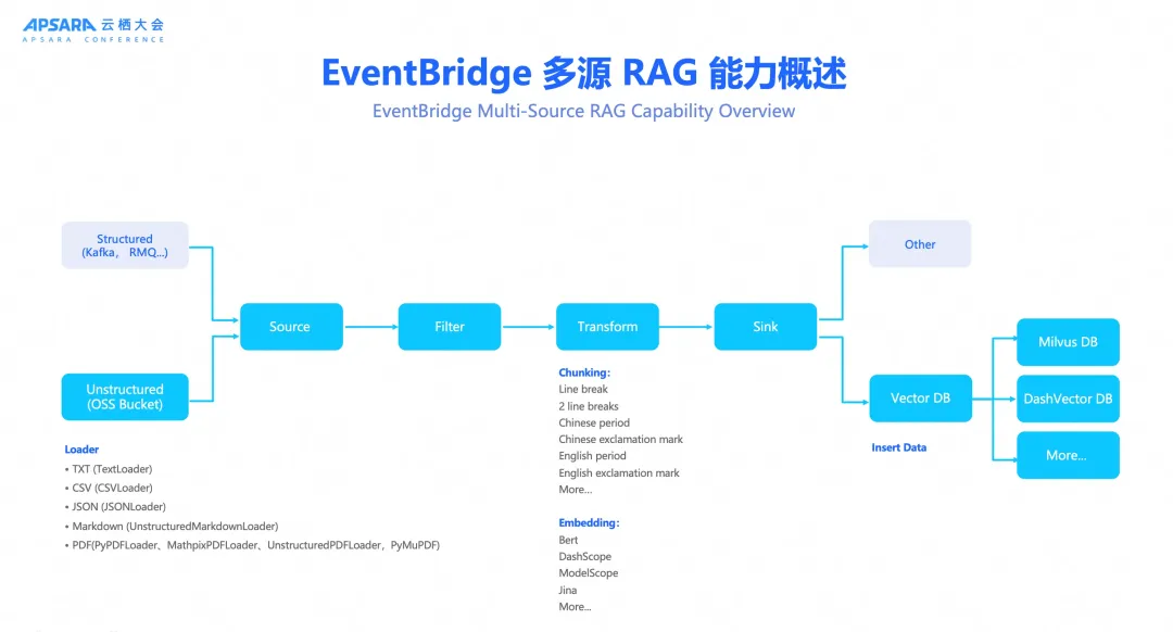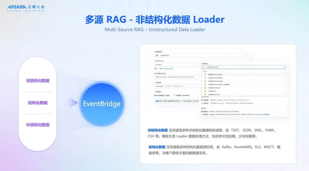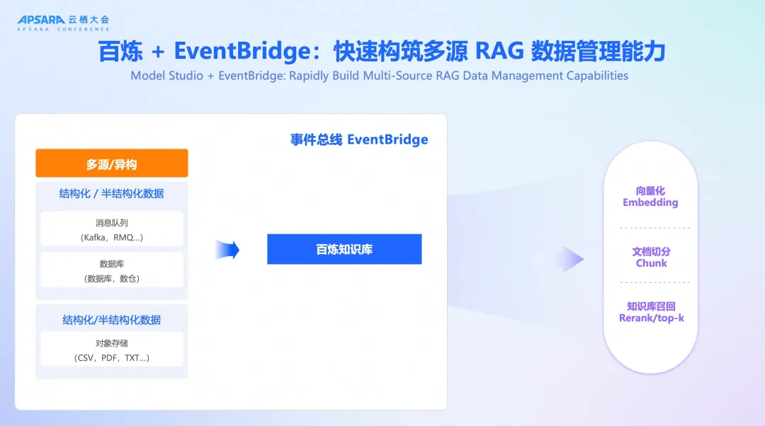 此次发布的另一大亮点是阿里云产品生态的强大协同能力。阿里云飞天实验室资深产品专家徐志远在演讲中详细介绍了百炼大模型服务平台如何基于 EventBridge,为企业提供一站式的 RAG 解决方案。