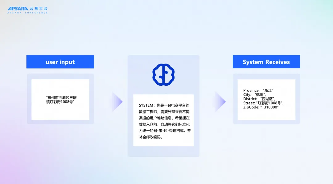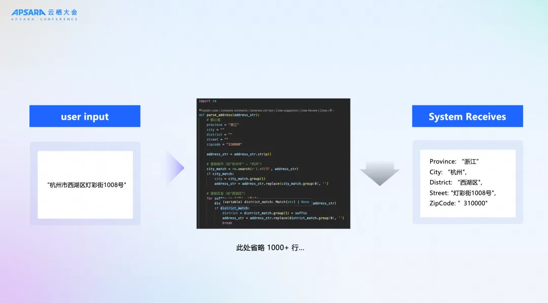 让我们来看一个非常经典的场景:地址信息标准化。用户在前端页面输入一个地址,格式五花八门。而后端系统为了入库和后续分析,需要将其解析成标准的“省-市-区-街道-邮编”格式。在过去,要实现这个功能,工程师需要编写上千行代码,处理各种异常情况,维护一个庞大的地址库,过程非常痛苦。