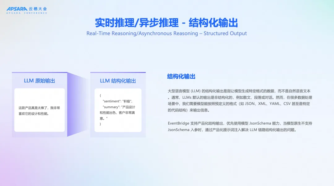 更关键的是,EventBridge 解决了大模型输出不稳定的核心痛点。通过内置的结构化输出(Structured Output) 能力,平台确保 AI 的每一次处理结果都以稳定、可靠的 JSON 格式返回,让数据转换告别“开盲盒”式的不确定性,为企业级应用的稳定性提供了坚实保障。
