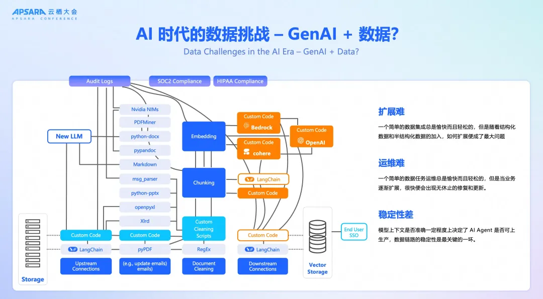 “一个简单的数据集成任务,开始时总是轻松愉快的,但随着业务扩展,数据源越来越多,格式越来越乱,整个数据链路就会变得一团糟。”陈涛在演讲中指出了当前 AI 数据处理的普遍困境。扩展难、运维难、稳定性差,这三大挑战已成为制约 AI 应用创新和落地的关键瓶颈。