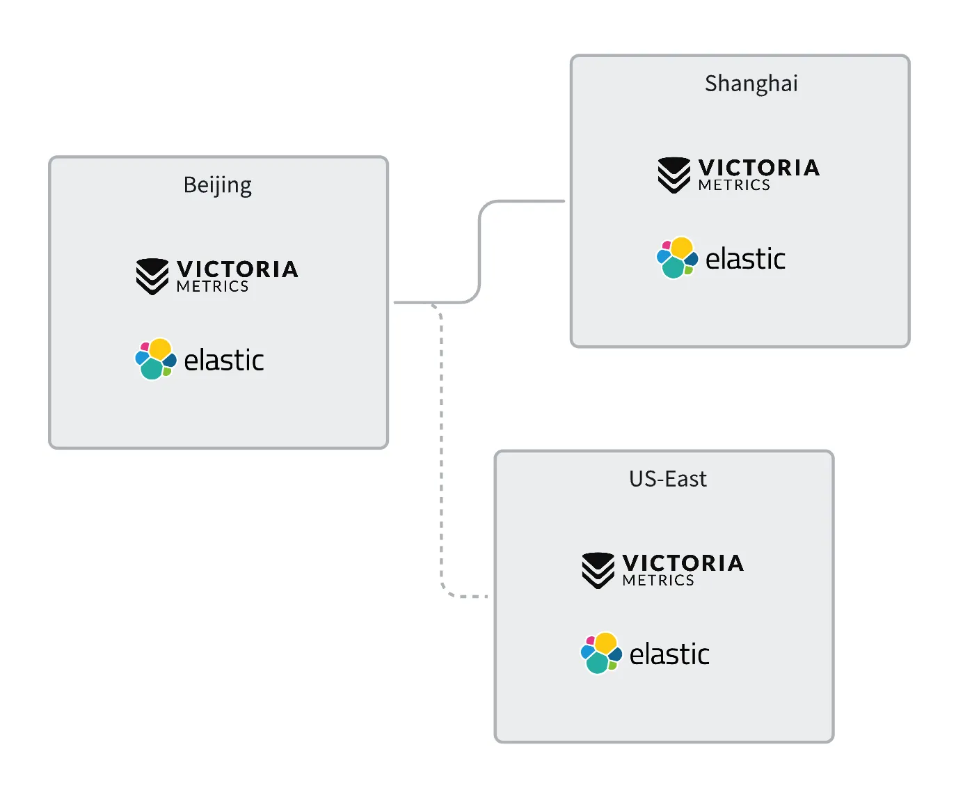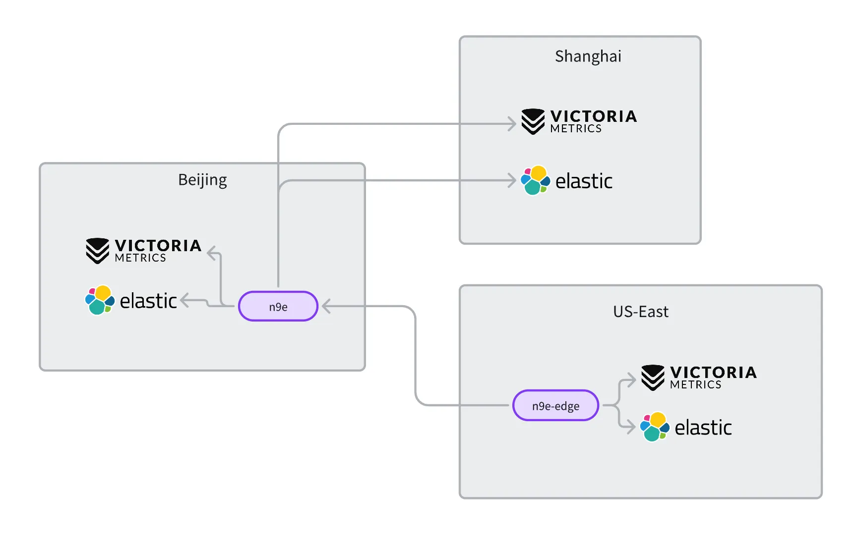 北京、上海、美东三地均部署了服务,指标和日志都选择落在本地,而非传输到中心。假设指标使用 VictoriaMetrics 存储,日志使用 ElasticSearch 存储,整体示例如下: