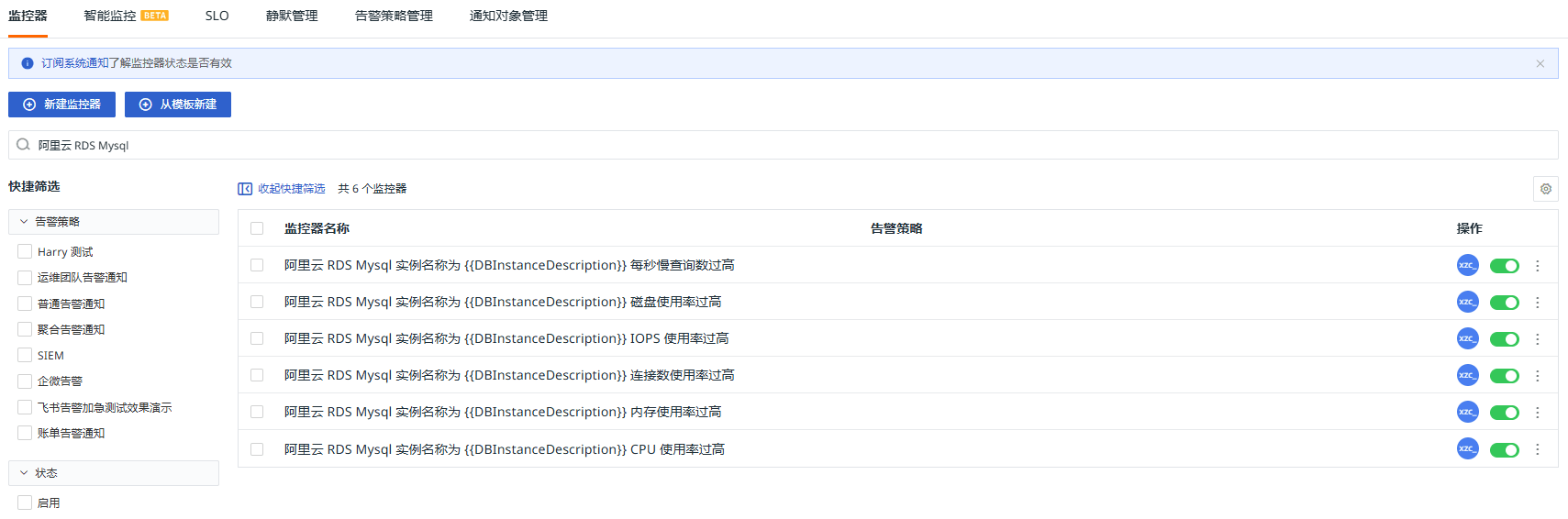观测云内置了监控器模板,可以选择从模版创建监控器,并开启适合业务的监控器以及时通知相关成员关注问题,触发条件、频率等信息可以依据实际业务进行调整。
