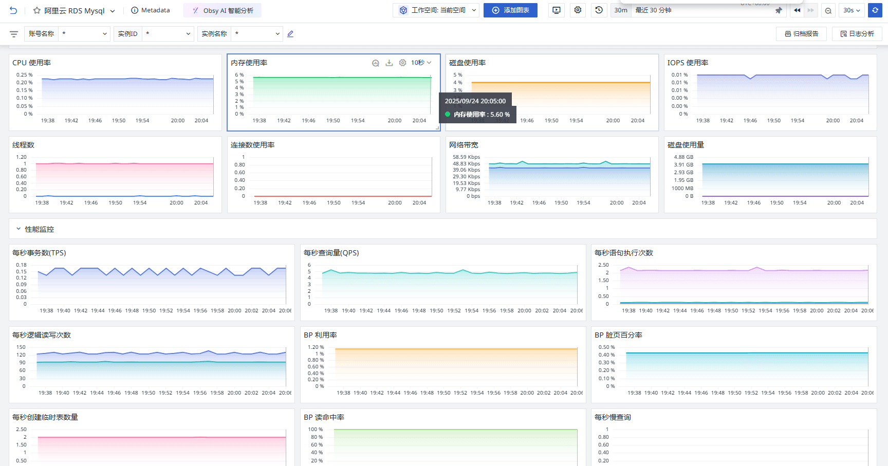观测云作为一款强大的全链路可观测性平台,能够为阿里云 RDS MySQL (Relational Database Service) 提供全方位的监控解决方案。通过与阿里云 RDS MySQL 的无缝集成,观测云可以实时采集 RDS 实例的性能指标、日志数据和追踪信息,实现从基础设施到应用层面的全面监控。用户不仅能够直观地查看 CPU、内存、网络、磁盘等关键指标的实时状态和历史趋势,还可以通过观测云的智能告警功能及时发现并处理异常情况。此外,观测云支持将 RDS 数据与其他云服务或本地应用的监控数据进行关联分析,帮助用户从全局视角洞察系统运行状况,优化资源配置,提升运维效率,确保阿里云 RDS 环境的稳定运行和高效管理。