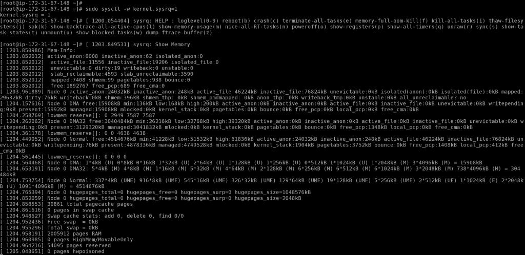 为此会话启用 Magic SysRq (sysctl -w kernel.sysrq=1),我首先列出可用的命令 (CTRL-0