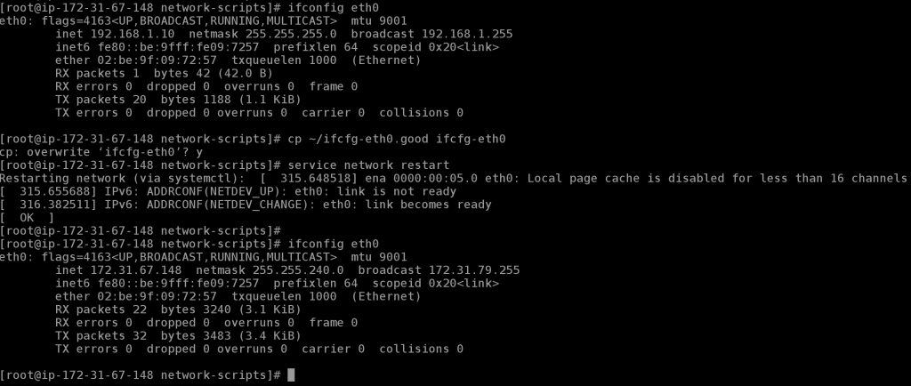 首先,我启动了一个 Amazon Linux 2 实例。登录到该实例后,我决定管理其以太网接口的网络配置 (/etc/sysconfig/network-scripts/ifcfg-eth0),设置一个完全虚构的静态 IP 地址。请不要在生产实例上尝试此操作!