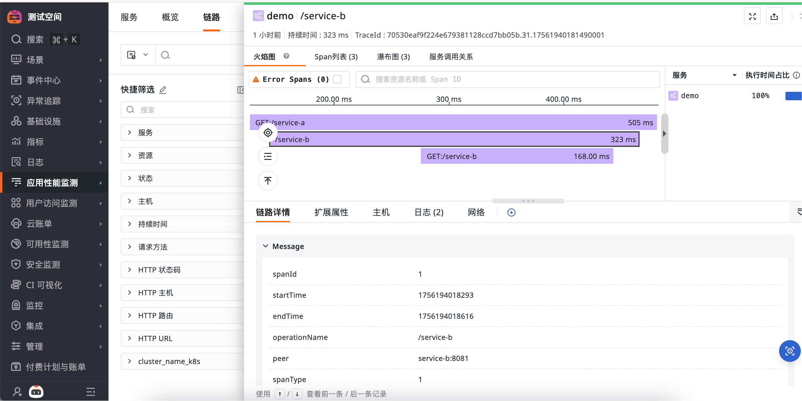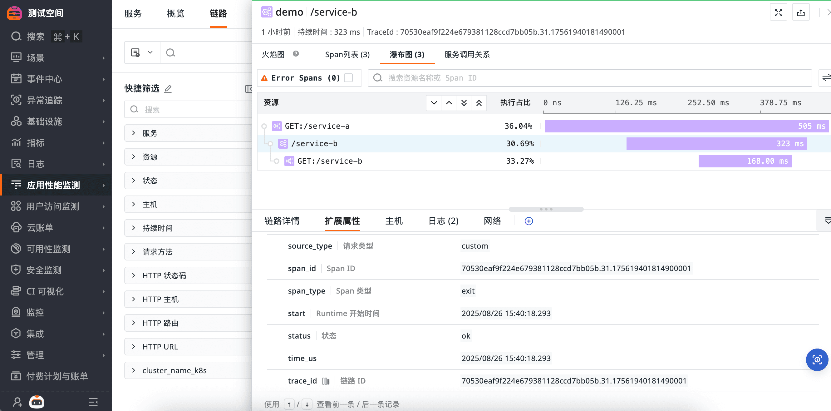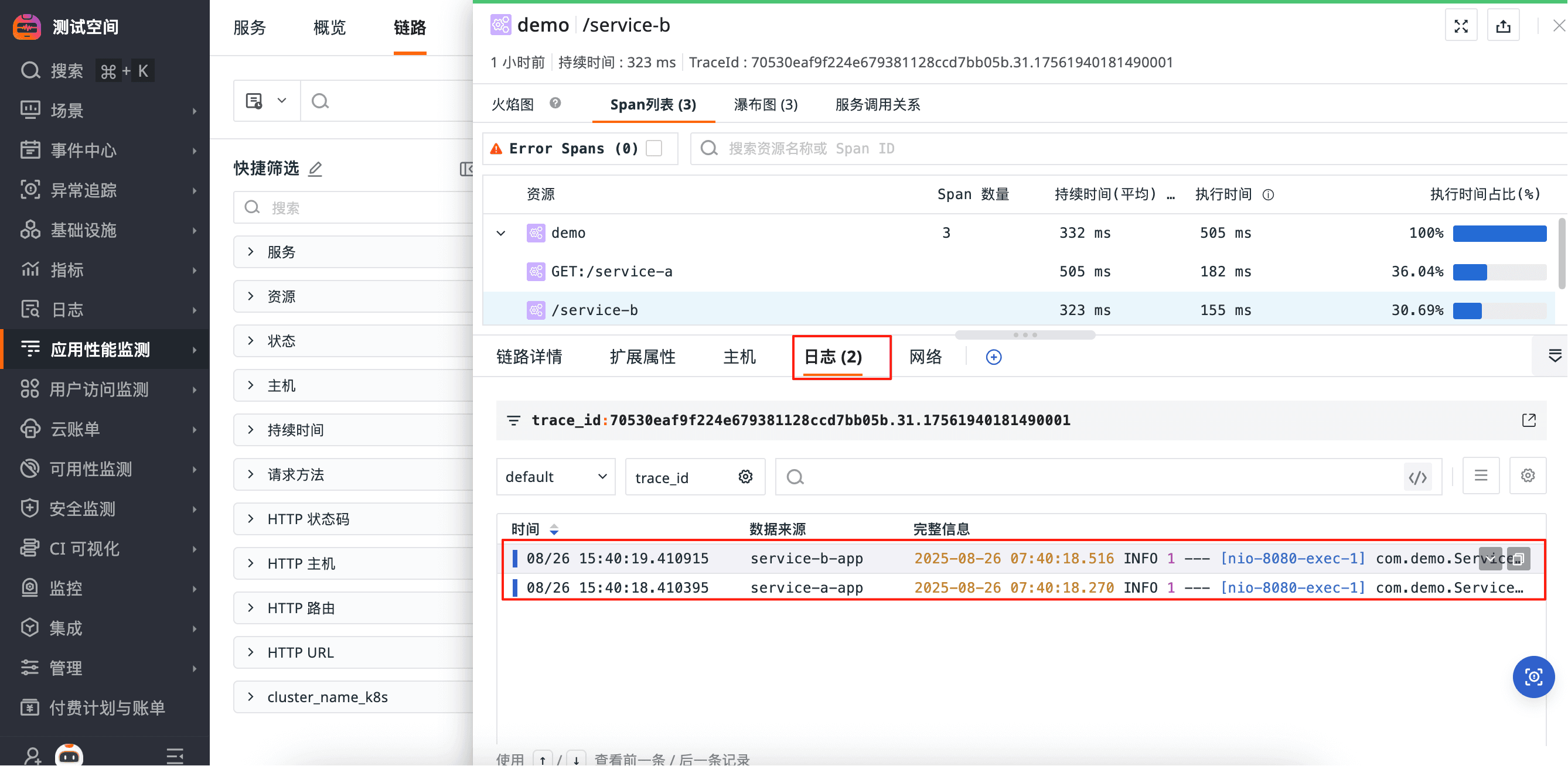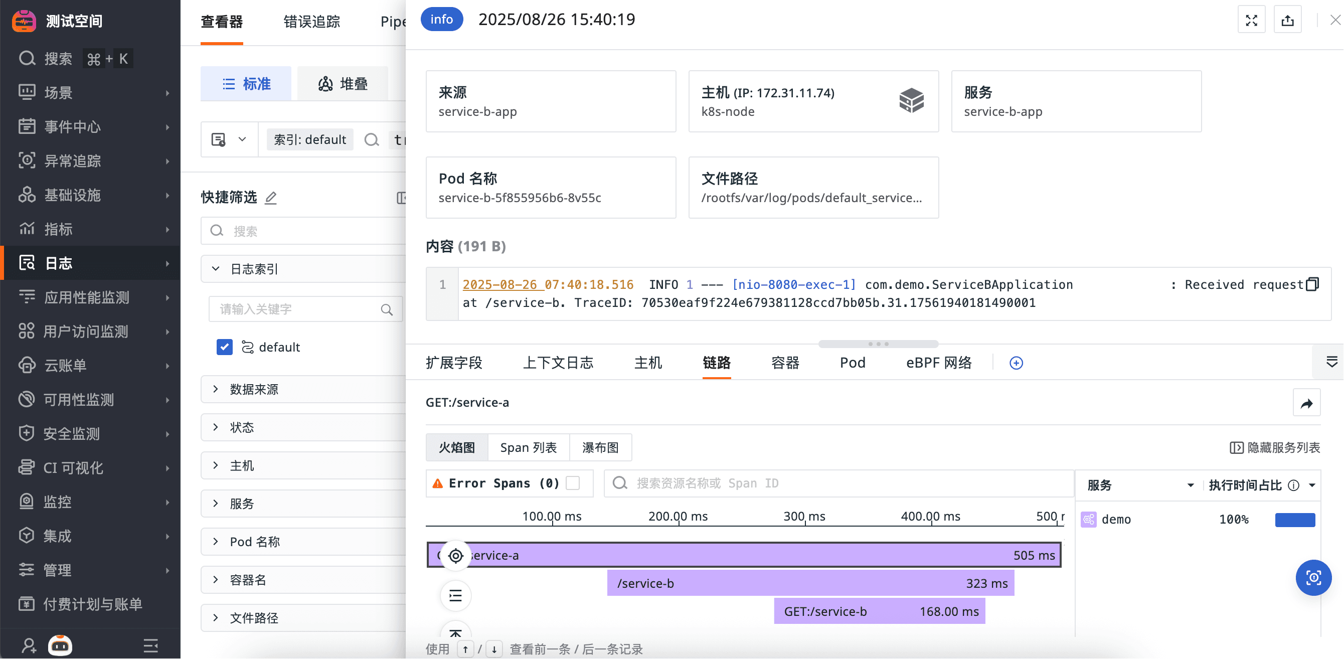 数据融合: 最终在观测云平台上实现了链路追踪数据与应用日志数据的无缝关联与联动查询,形成了完整的可观测性闭环。