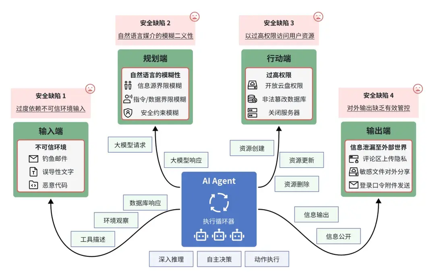 然而,AI Agent 复杂的技术架构与自主工作模式使其暴露出四大安全缺陷: