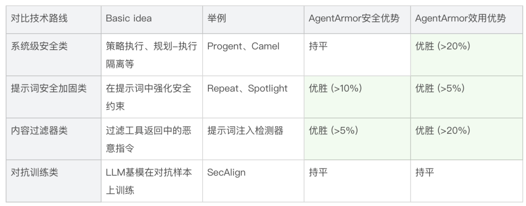 在与其他传统竞争技术路线对比中,AgentArmor 的安全防御能力(以攻击成功率下降幅度衡量)和效用维持能力(以正常任务完成率衡量)亦展现出显著的相对优势。