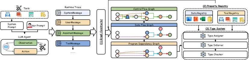在 AI Agent 工作时,AgentArmor 首先借助图构建器,将 AI Agent 运行过程中的执行轨迹迅速且精准地转化为程序依赖图,从而清晰呈现其控制流与数据流。接着,依靠属性注册表进一步完善程序依赖图,不仅详细添加 AI Agent 调用工具的内部数据流细节,还为程序依赖图中的数据节点与行为节点设置初始类型,以此赋予各节点安全属性。最后,通过类型系统全面完善整个图中的类型标签,并严格对程序依赖图开展类型检查,以切实防止任何不安全的操作出现,确保 AI Agent 的运行安全。
