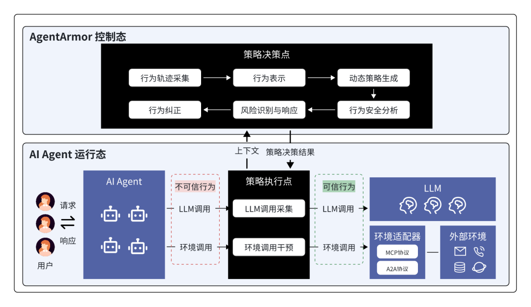 行为采集:收到用户请求后,策略执行点以上下文为载体,采集 AI Agent 的不可信行为并传送至策略决策点。