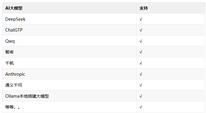 模型管理:支持对接各种大模型,包括本地私有大模型(Deepseek/ Llama 3 / Qwen 2 等)、国内公共大模型(通义千问 / 腾讯混元 / 字节豆包 / 百度千帆 / 智谱 AI / Kimi 等)和国外公共大模型(OpenAI / Claude / Gemini 等);