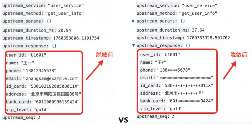 对于运维团队来说,以往排障往往依赖包含用户手机号、地址、账户号的明文日志,这在合规上存在高风险。现在,脱敏后的日志让这一过程从源头安全化,在问题定位场景中通过 trace_id 检索即可复原整个调用链: