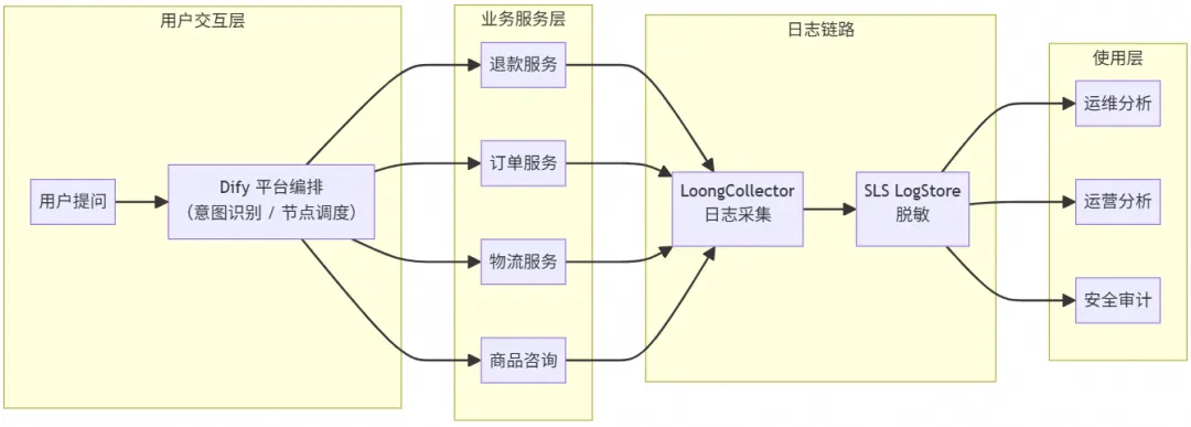 因此,选择在 Dify 服务部署侧通过 LoongCollector 采集服务日志,通过 LoongCollector 将日志统一推送到 SLS LogStore。