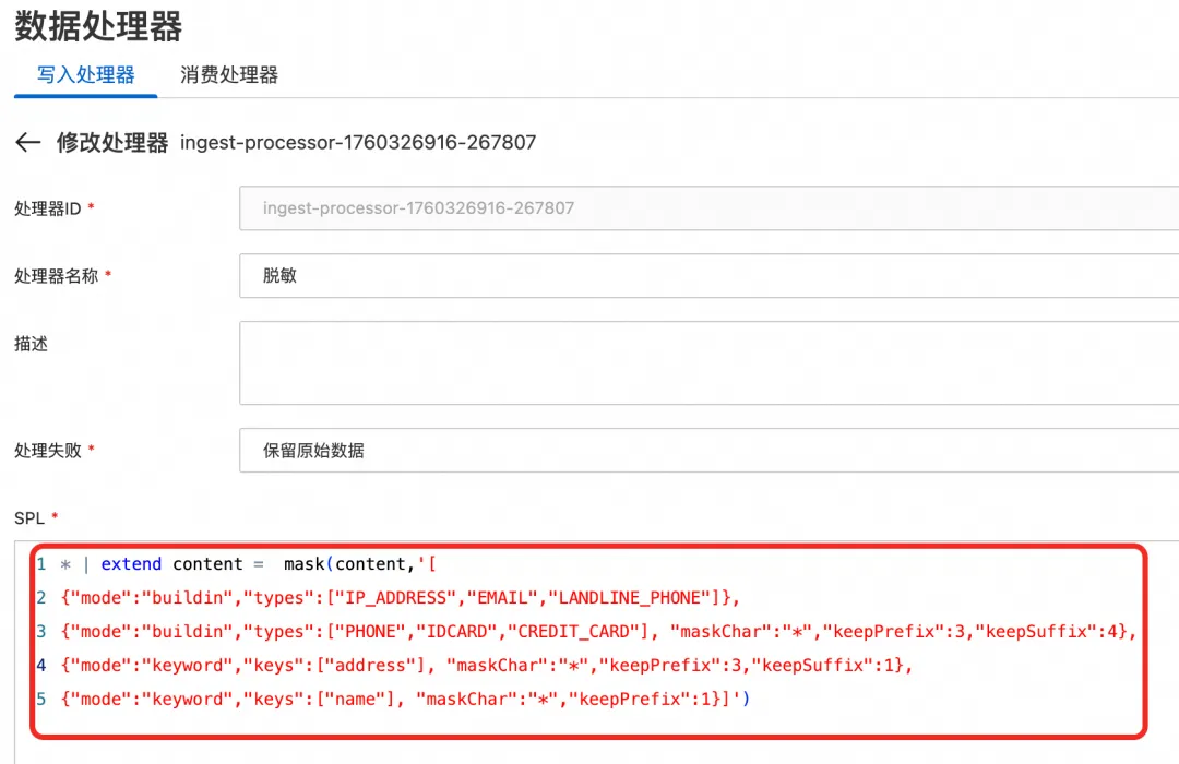 写入脱敏: 通过写入处理器配置 SPL 脱敏(mask)函数,确保敏感字段在入库时已被打码。