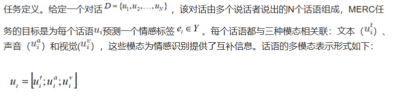 然而,人类的情感通常是通过多种感官渠道来传达的,包括听力、视觉和语言。因此,近期的研究越来越多地关注对话中的多模态设置,这一领域被称为对话中的多模态情感识别(MERC)。研究者们通过整合不同模态的上下文信息,旨在识别特定话语背后的情感状态,这些信息通常包括微妙的个人情感,如快乐、愤怒和仇恨,从而提高对话中情感识别的准确性。 图 1 展示了一个包含文本、声学和视觉输入的 ERC 示例。