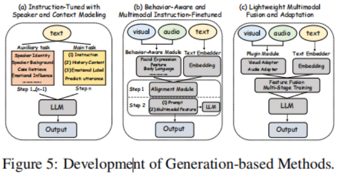指令调优与说话人及上下文建模。ERC 任务主要依赖于判别性建模框架。随着大语言模型(LLM)的兴起,InstructERC 首次提出了 ERC 的生成框架。该框架引入了一个简单而有效的基于检索的提示模块,帮助 LLM 显式地整合对话中的多粒度监督信号。此外,它还结合了一个辅助的情感对齐任务,以更好地模拟对话中说话者之间复杂的情感变化。受 COSMIC 中常识知识整合的启发,近期的研究设计了一种基于对话历史的提示生成方法,通过将常识知识注入 ERC,利用 LLM 提取与说话人相关的常识。