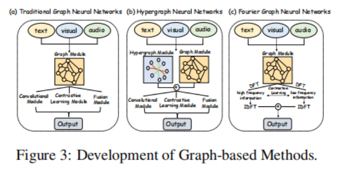 对话可以自然地被解释为图结构,因为话语之间存在内在的相关性和依赖性。对话通常涉及多轮互动,具有复杂的依赖和交互模式,这些可以通过图神经网络(GNNs)的边结构进行有效建模(Scarselli 等,2009)。随着对多模态对话理解的兴趣日益增加,GNNs 的应用已从文本数据扩展到多模态输入(Liu 等,2024a)。此外,最近的方法还集成了辅助模块(如卷积、对比学习和融合),以提升性能。图 3 展示了基于图的方法的最新进展。论文将它们分为传统图、超图和傅里叶图神经网络。
