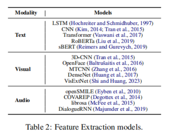 特征提取。为了实现有效的多模态分析,必须首先从每个模态流(文本、音频、视觉)中提取特征。主流方法通常在这一初始阶段分别处理这些模态。尽管核心提取技术往往有重叠,但在多模态设置中,关键区别在于这些特征的使用目的和后续应用。在单模态情感识别中,提取器的目标是在单一模态内捕捉足够信息以进行情感分类。表 2 概述了本文调查的多模态研究中常用的特征提取模型。