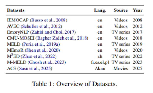 MERC 旨在通过整合语言、声学、视觉信号等多种模态,来理解情感。尽管最近的研究引入了多种建模策略,但在数据稀缺、模态对齐以及跨语言和文化的泛化方面仍面临重大挑战。