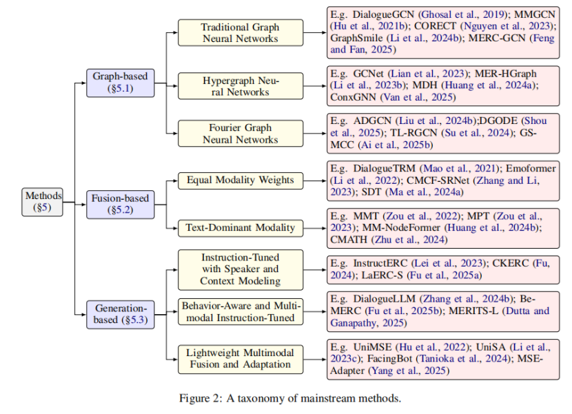 本节探讨了 MERC 任务的最新方法。论文从三个角度进行了总结:基于图的方法、基于融合的方法以及基于生成的方法。图 2 展示了这些方法及其子类别的概述,并附有代表性示例。