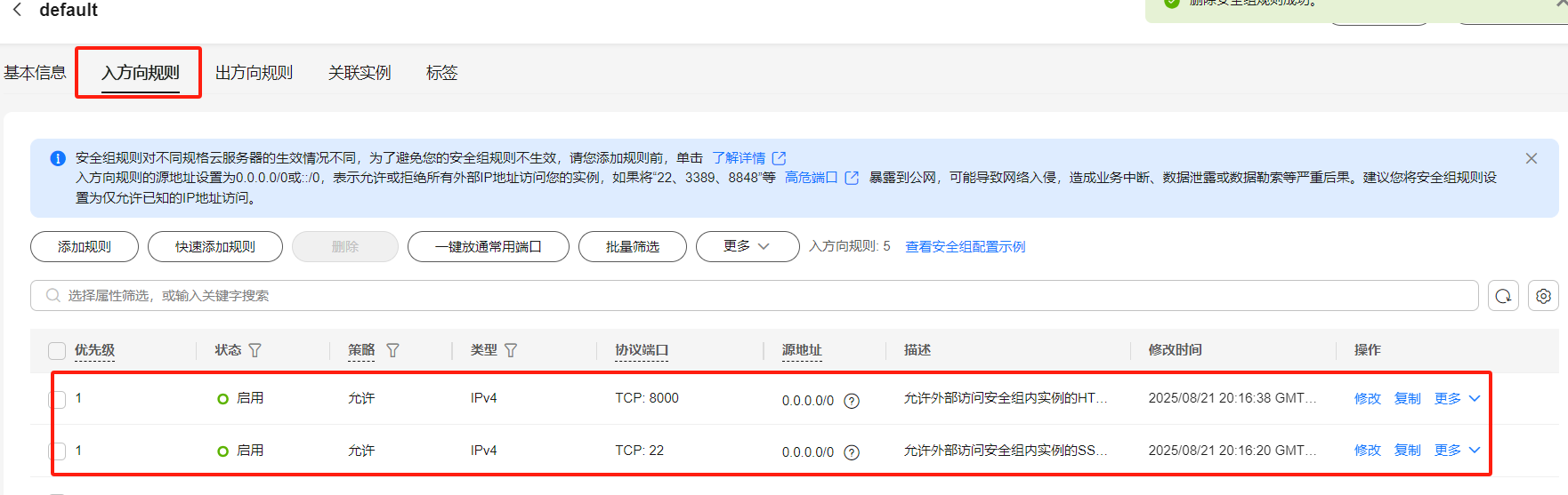 在 GaussDB 数据库实例的基础信息页修改安全组,开放 22 端口与 8000 端口:
