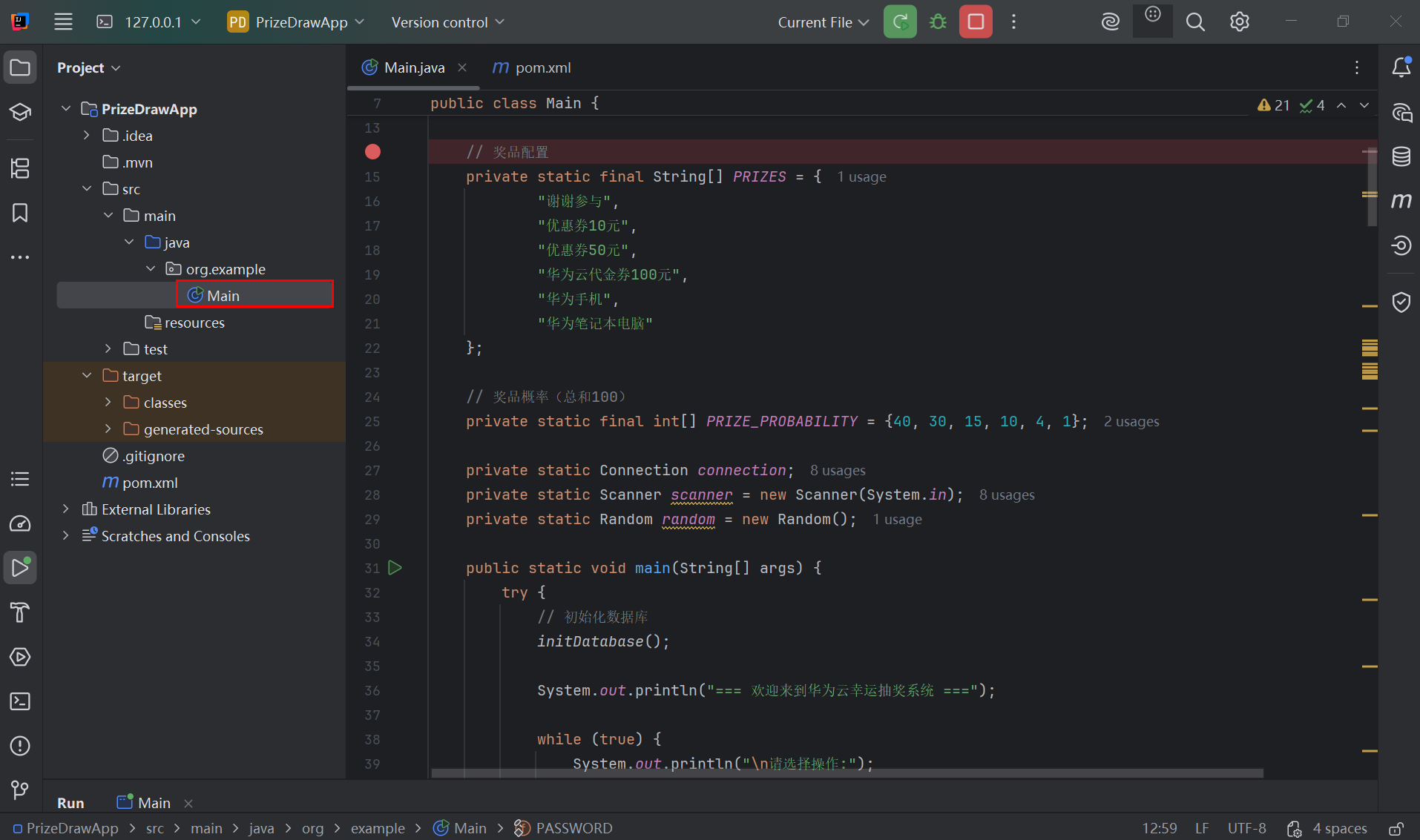 // 随机抽奖 int prizeIndex = getRandomPrizeIndex(); String prize = PRIZES[prizeIndex];