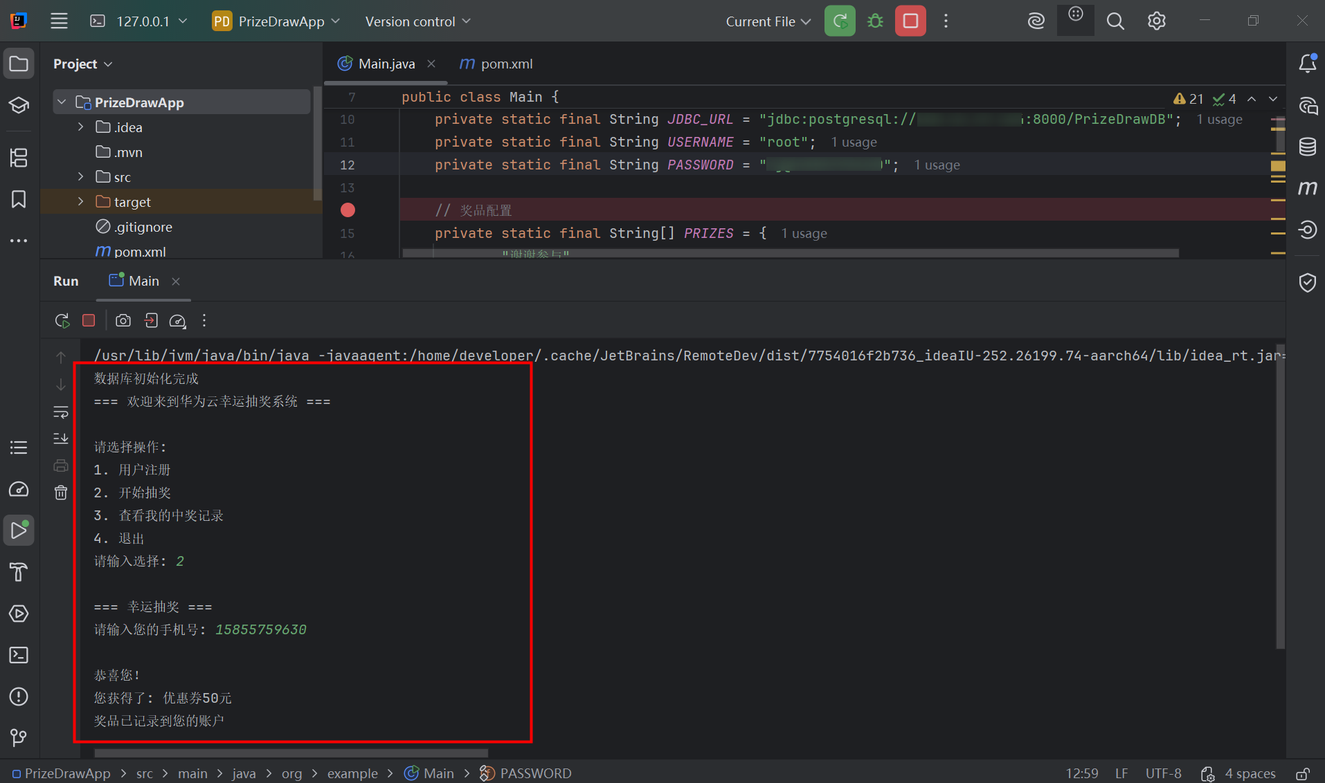 本案例通过本地 IDEA 连接华为云开发环境,通过本地的 IDEA 进行远程编程并连接 GaussDB 数据库来构建抽奖小程序应用。